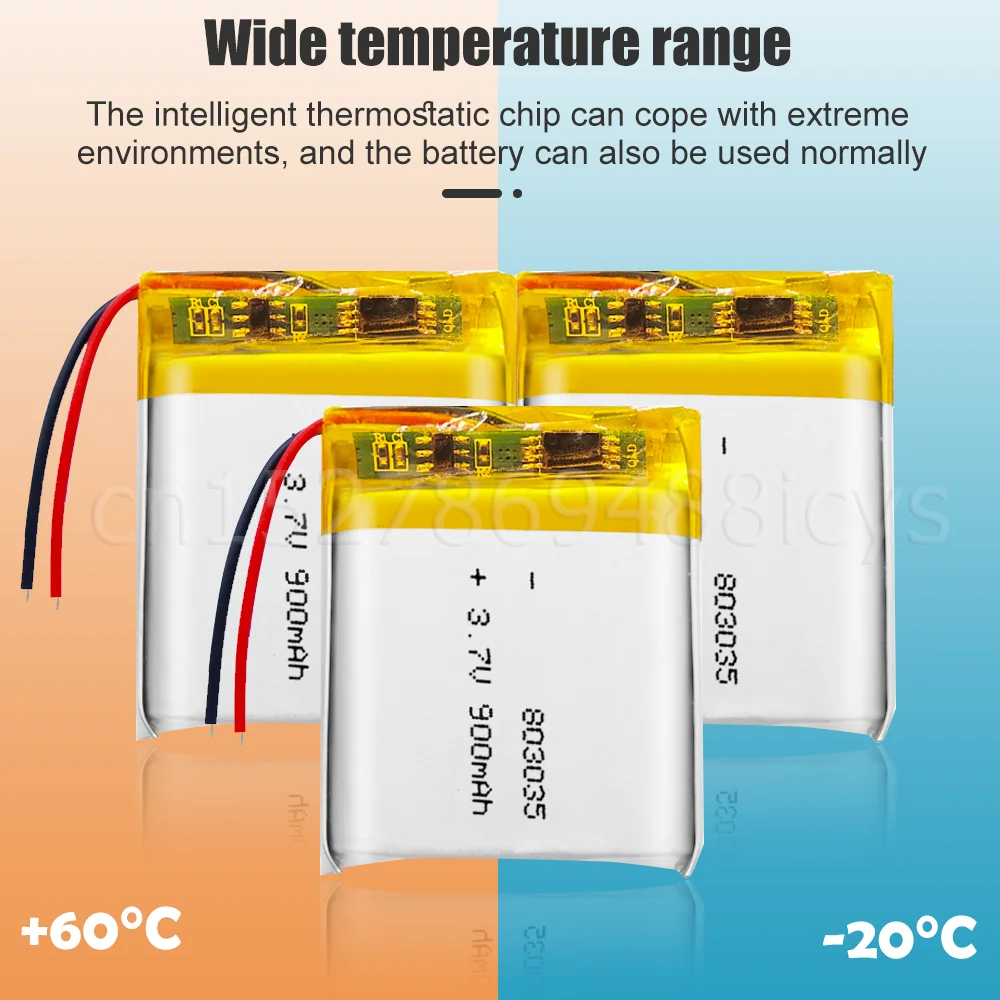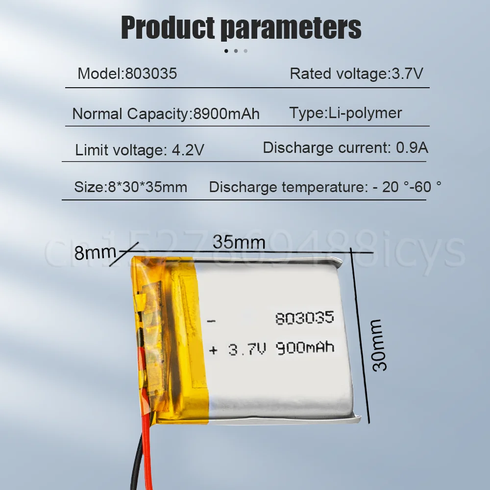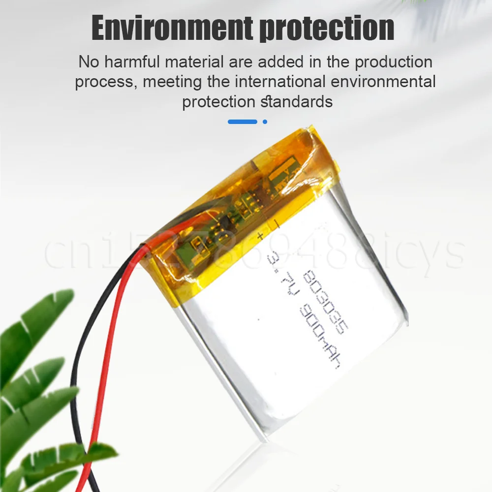 La batterie aste en lithium polymère 803035 est un excellent choix pour les appareils tels que les MP3, MP4, GPS, jouets, casques Bluetooth, haut-parleurs et ventilateurs de montre intelligente. Elle dispose d’une capacité de 900mAh et est rechargeable. Sa tension de charge est de 4.2V et sa tension nominale est de 3.7V. Avec une température de fonctionnement allant de -10 °C à 50 °C, cette batterie est adaptée à une utilisation dans diverses conditions.