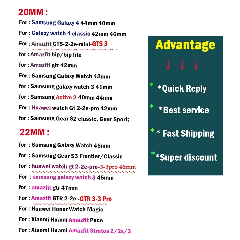 Le bracelet de montre de 20mm est conçu pour être compatible avec les modèles de montres Samsung Galaxy Watch 6/5/4/3/Classic/active 2 44mm 40mm, Gear S3, et HUAWEI Watch GT-2. Il convient également à d’autres montres traditionnelles ou intelligentes avec une largeur standard de 20mm.