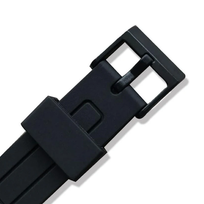 Nous apprécions particulièrement sa compatibilité avec différents modèles de montres, offrant une flexibilité de choix en termes de largeurs disponibles (16mm, 18mm et 20mm). Son design sobre en résine noire avec des broches lui confère une apparence classique et polyvalente, adaptée à toutes les occasions.
