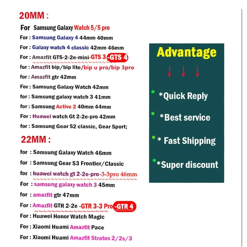 | Compatibilité | Amazfit GTR/GTS-4-3-2-2e-Mini-Pro/Stratos 2-3 et autres marques |