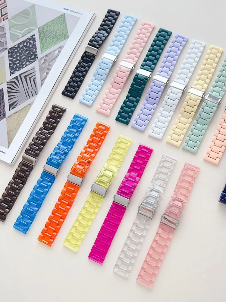 Les maillons amovibles permettent un ajustement facile, tandis que le design transparent donne un look moderne et élégant à la montre. La couleur transparente peut sembler lumineuse sur les photos, donc il est important de faire attention lors de l’achat.