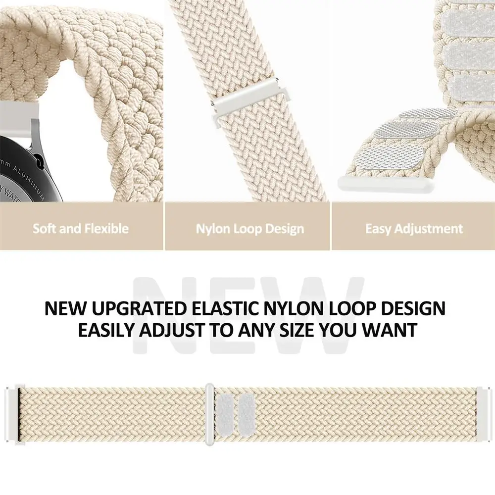 Le bracelet tressé Solo Loop est spécialement conçu pour les montres Samsung Galaxy Watch et Huawei Watch. Fabriqué en nylon élastique, il est compatible avec les modèles Samsung Galaxy Watch 5, Pro, 4, 6, Classic, 3, Active 2, ainsi que les modèles Huawei Watch 4, 2e, 2 et 3 Pro Band.