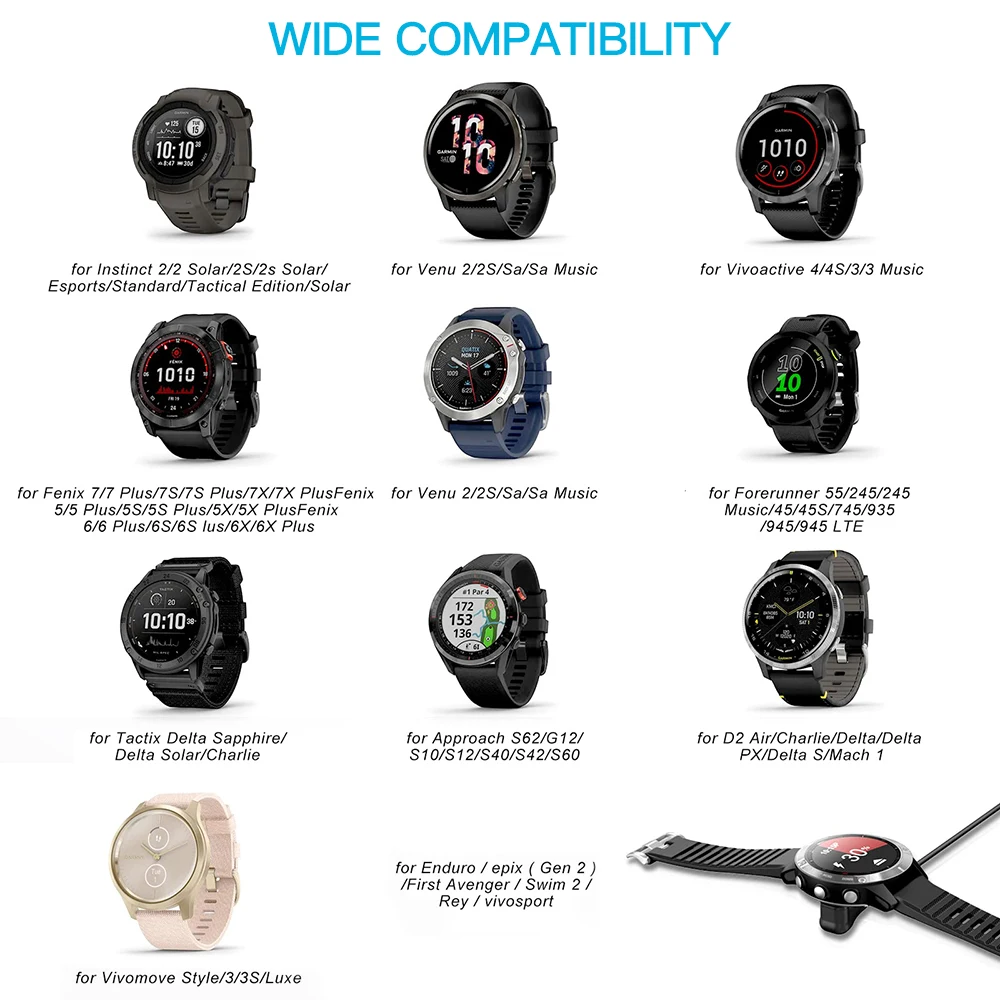 | Protection contre les courts-circuits et les surtensions | Haute performance en termes de sécurité et d’anti-interférence | Compatible avec une large gamme de montres Garmin | 1 câble de chargement USB |