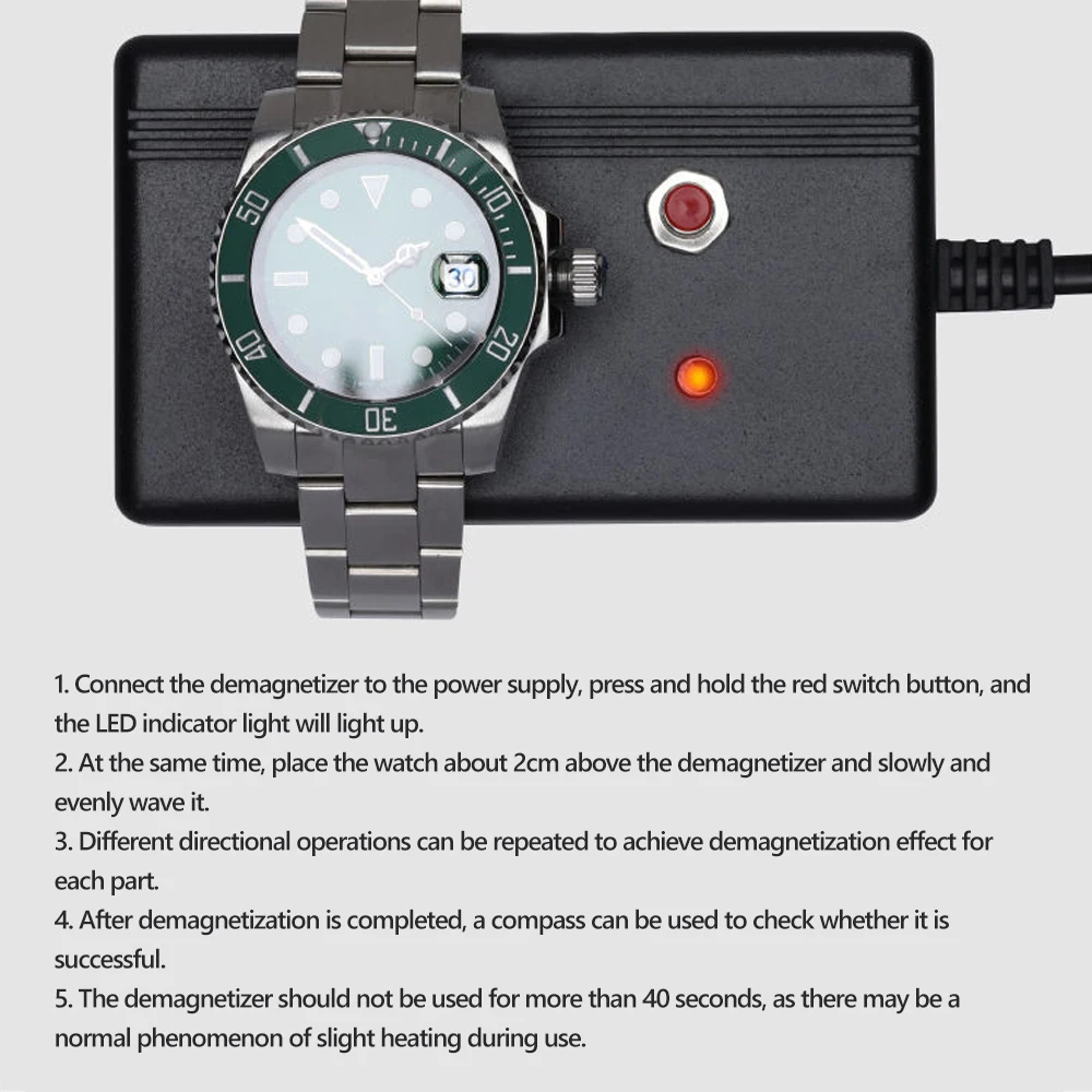R: Le démagnétiseur ne doit pas être utilisé pendant plus de 40 secondes afin d’éviter tout risque de surchauffe. Une fois la démagnétisation terminée, vérifiez à l’aide de la boussole si la montre a été démagnétisée avec succès.