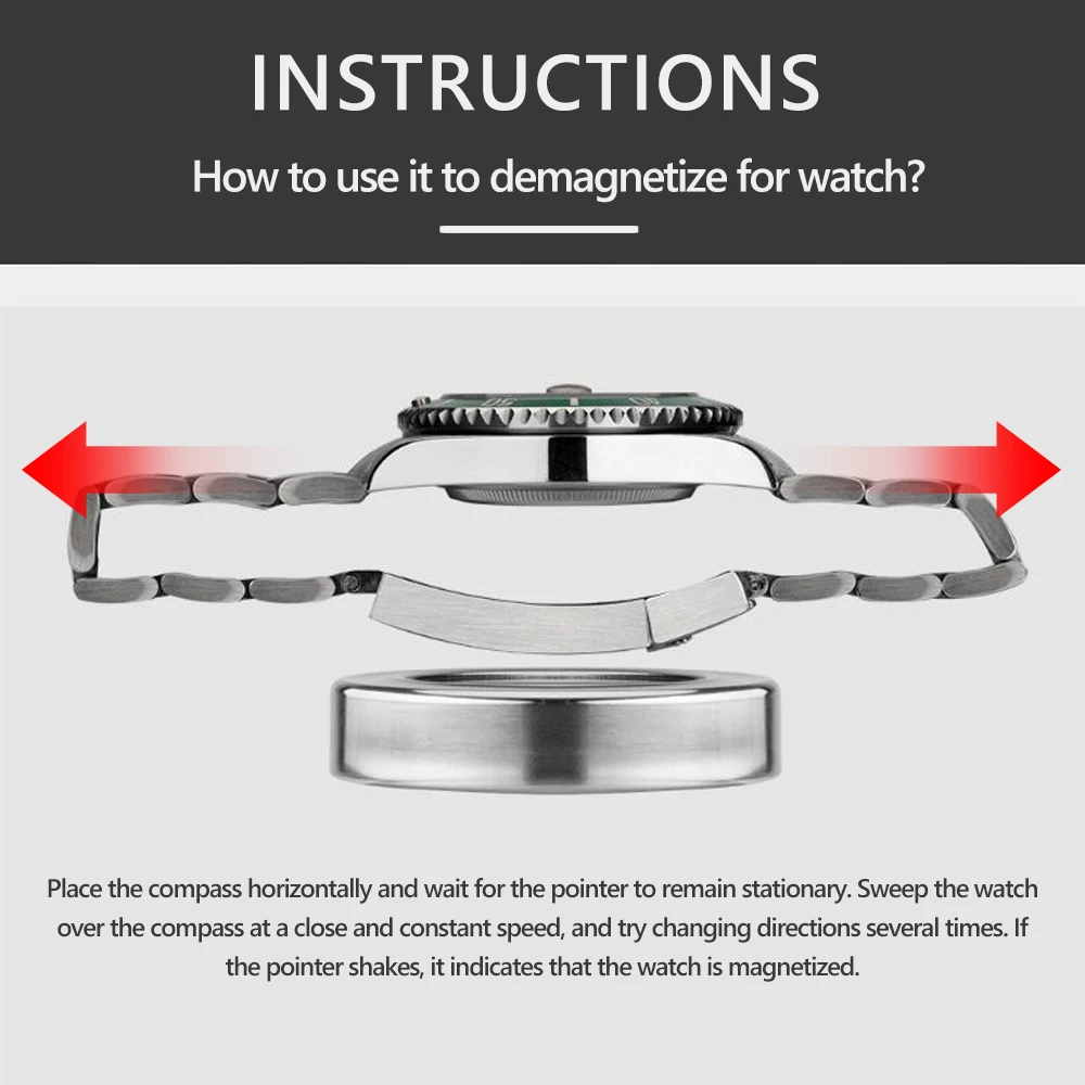 R: Pour utiliser le démagnétiseur, connectez-le à une prise électrique, maintenez le bouton d’interrupteur enfoncé et placez la montre à démagnétiser au-dessus de l’appareil. Pour utiliser la boussole, placez-la horizontalement et balayez la montre sur celle-ci pour vérifier si elle est magnétisée.