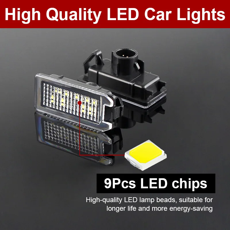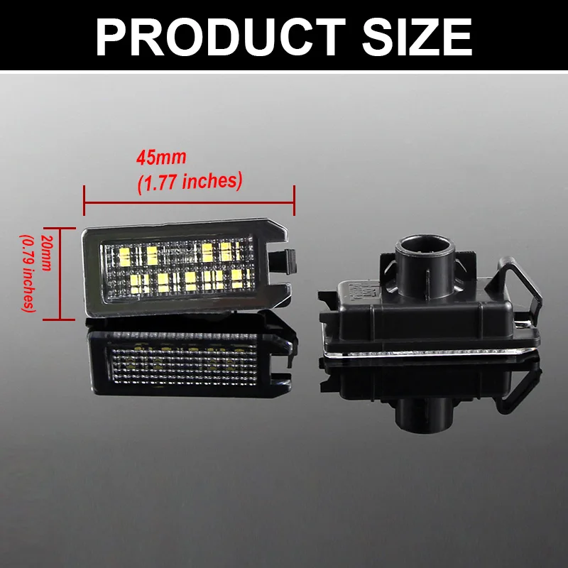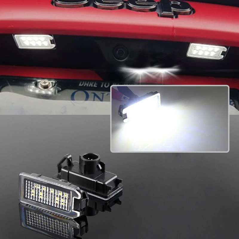 Paire de lampe de plaque d’immatriculation LED haute puissance 18SMD. Plug and Play, démarrage rapide et instantané. Installation facile, remplacement direct avec la qualité et l’ajustement d’OEM. Lumière de couleur blanche 6500K. Spécialement conçu sans code d’erreur d’avertissement, message d’avertissement de sortie d’ampoule, aucune reprogrammation d’ordinateur nécessaire. Haute luminosité. Lentille frontale transparente spéciale pour une diffusion étendue de la lumière LED.