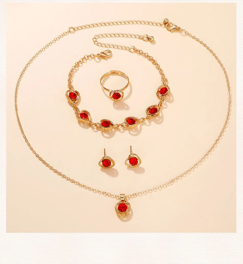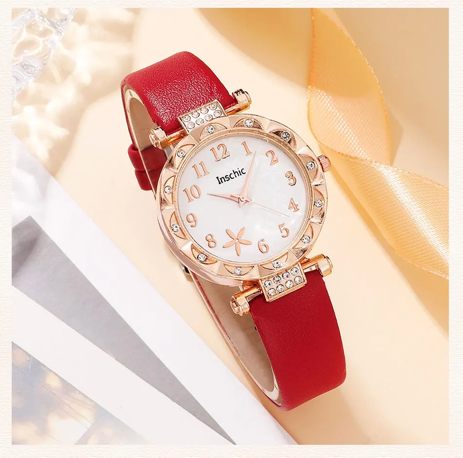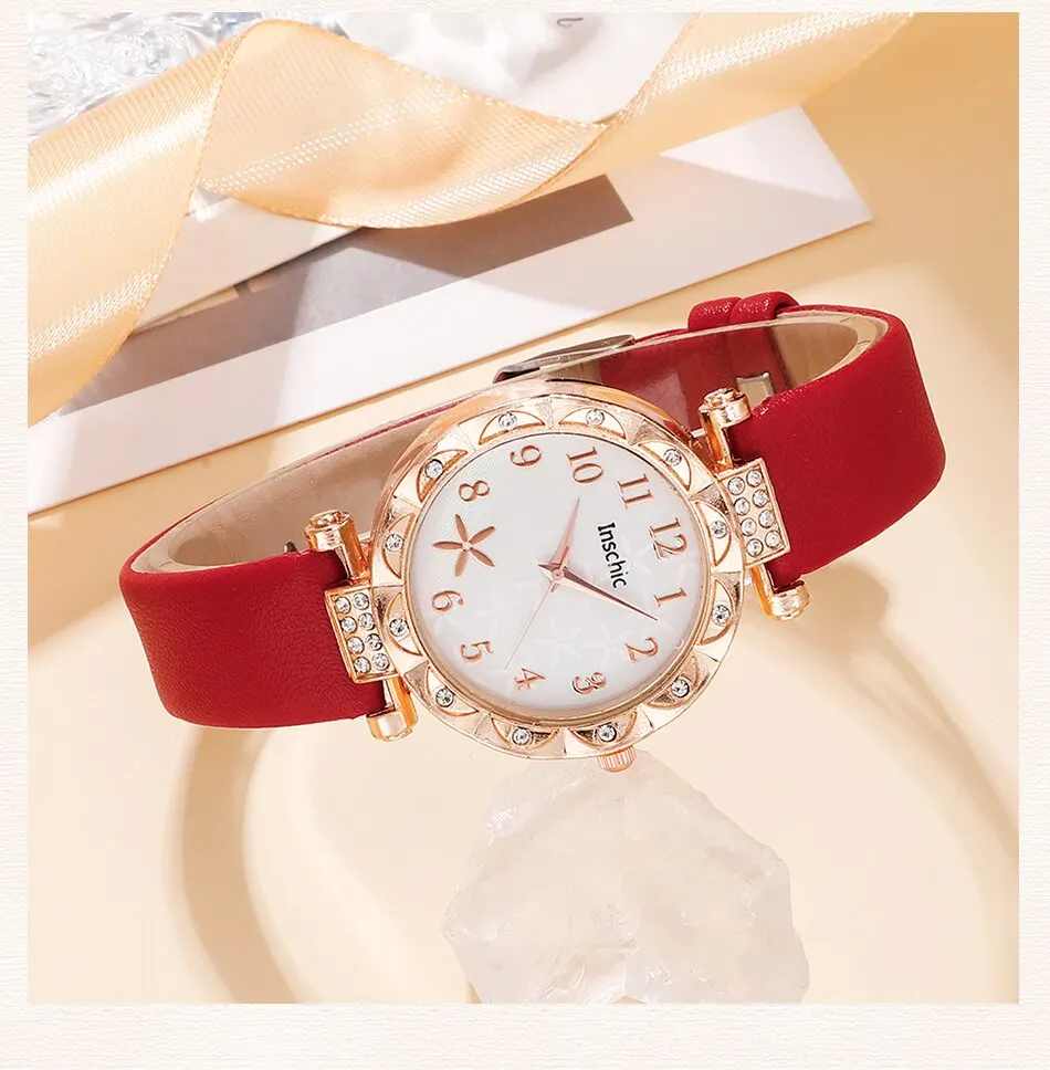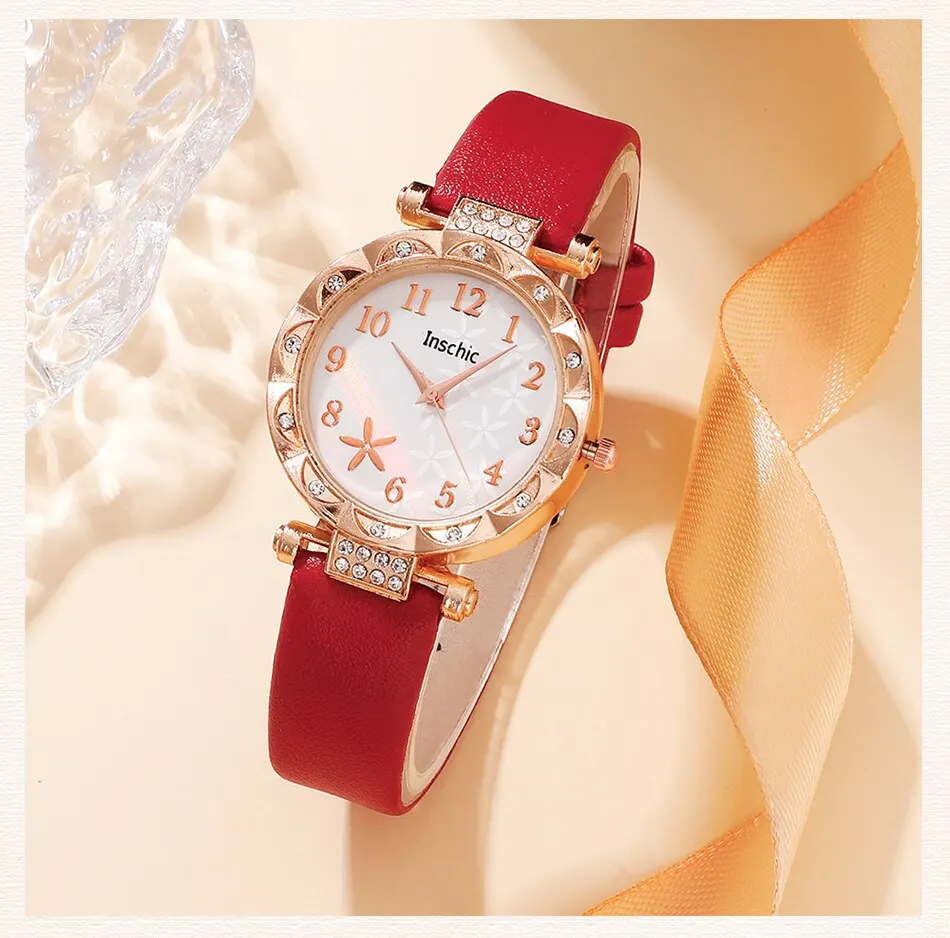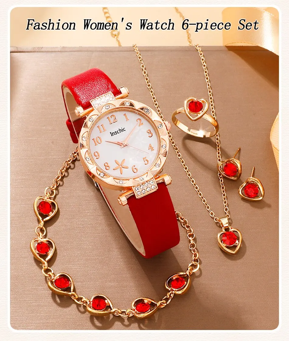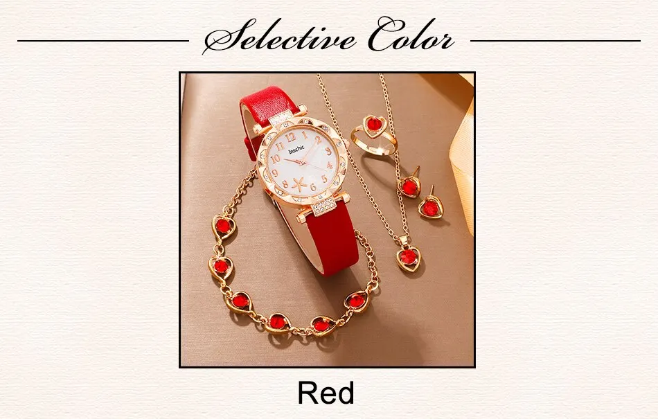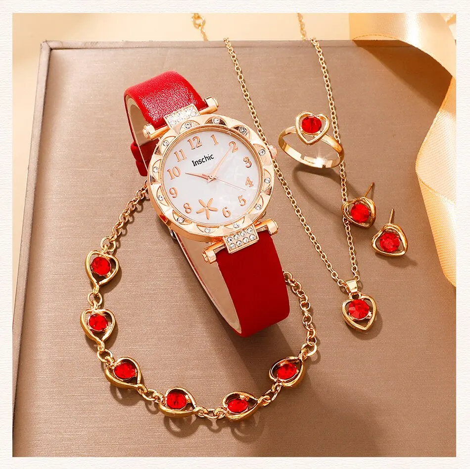 La Montre à quartz de luxe rouge pour femme est un ensemble de 6 pièces comprenant une montre, une bague, un collier et deux paires de boucles d’oreilles. La conception incrustée de strass ajoute une touche de glamour à cet ensemble d’accessoires de mode polyvalent. La montre dispose d’un mouvement à quartz fiable, offrant un chronométrage précis. Le matériau de