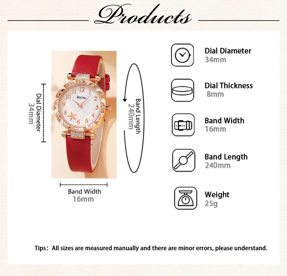 | Ensemble d’accessoires de mode polyvalente : | Cet ensemble de 6 pièces comprend une montre, une bague et un collier, ce qui en fait un ensemble d’accessoires de mode polyvalent qui peut être mélangé et assorti pour s’adapter à n’importe quelle occasion. |