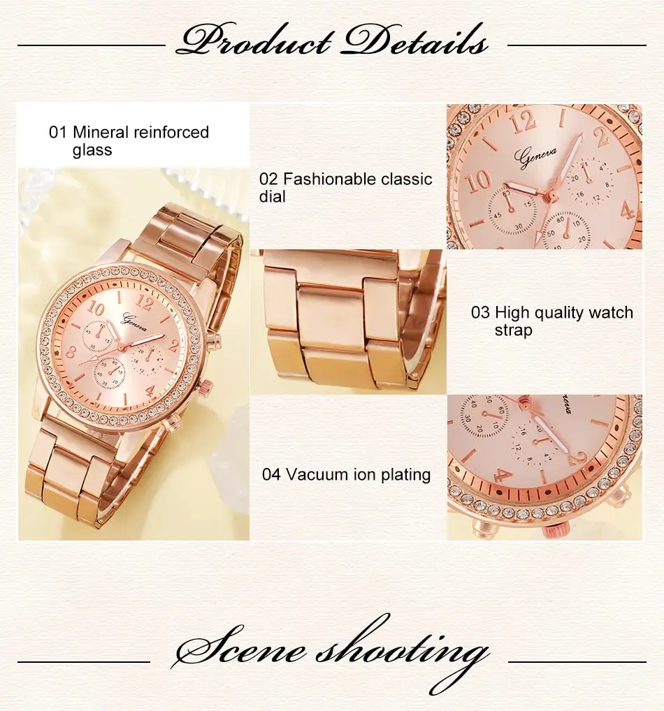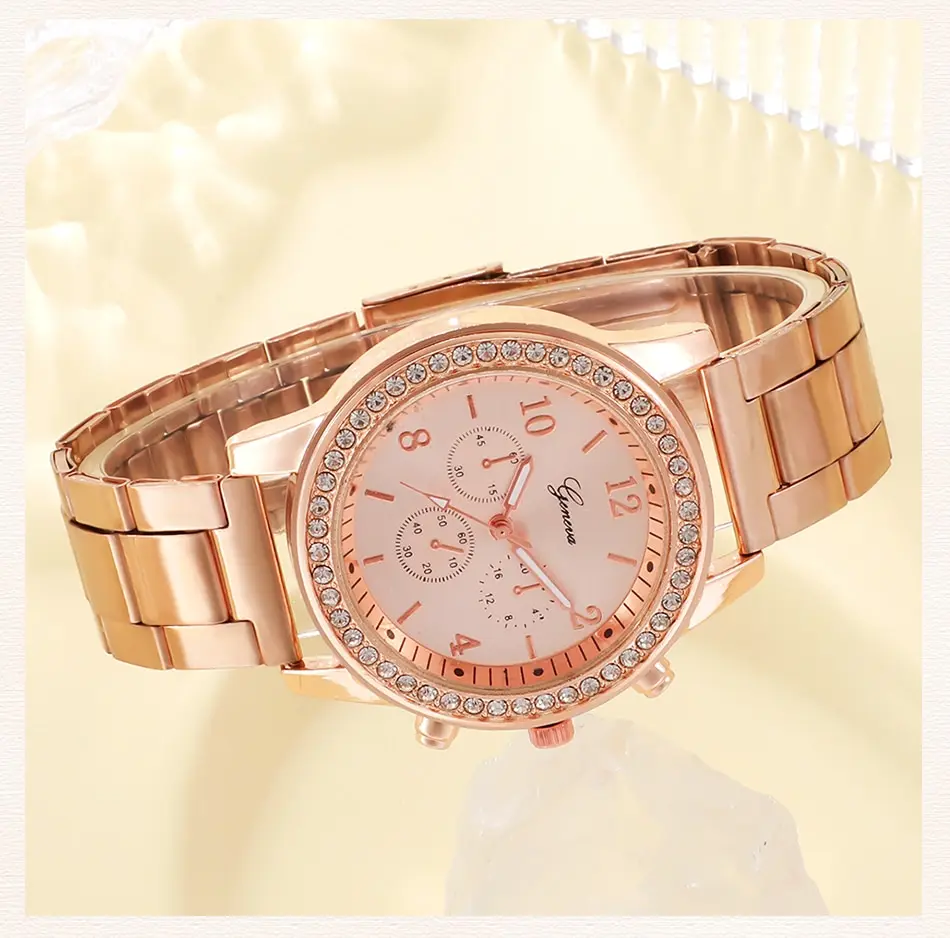 Cet ensemble 6PCS Set Or Rose Montre De Luxe Femmes Anneau Collier Boucle D’oreille Strass Mode Montre-Bracelet Casual Dames Bracelet Montres est un excellent choix pour les femmes avides de mode. Avec son design incrusté de strass et ses accessoires polyvalents, cet ensemble ajoutera une touche de glamour à n’importe quelle tenue. De plus, le mouvement à quartz garantit une précision de chronométrage, ce qui en fait un choix pratique pour un usage quotidien. Le matériau du boîtier en alliage durable assure également sa longévité. Cependant, il convient de noter que cet ensemble n’est pas étanche à l’eau pour la natation et la plongée. Globalement, nous recommandons cet ensemble aux femmes soucieuses de leur style et à la recherche d’accessoires polyvalents pour toutes les occasions.
