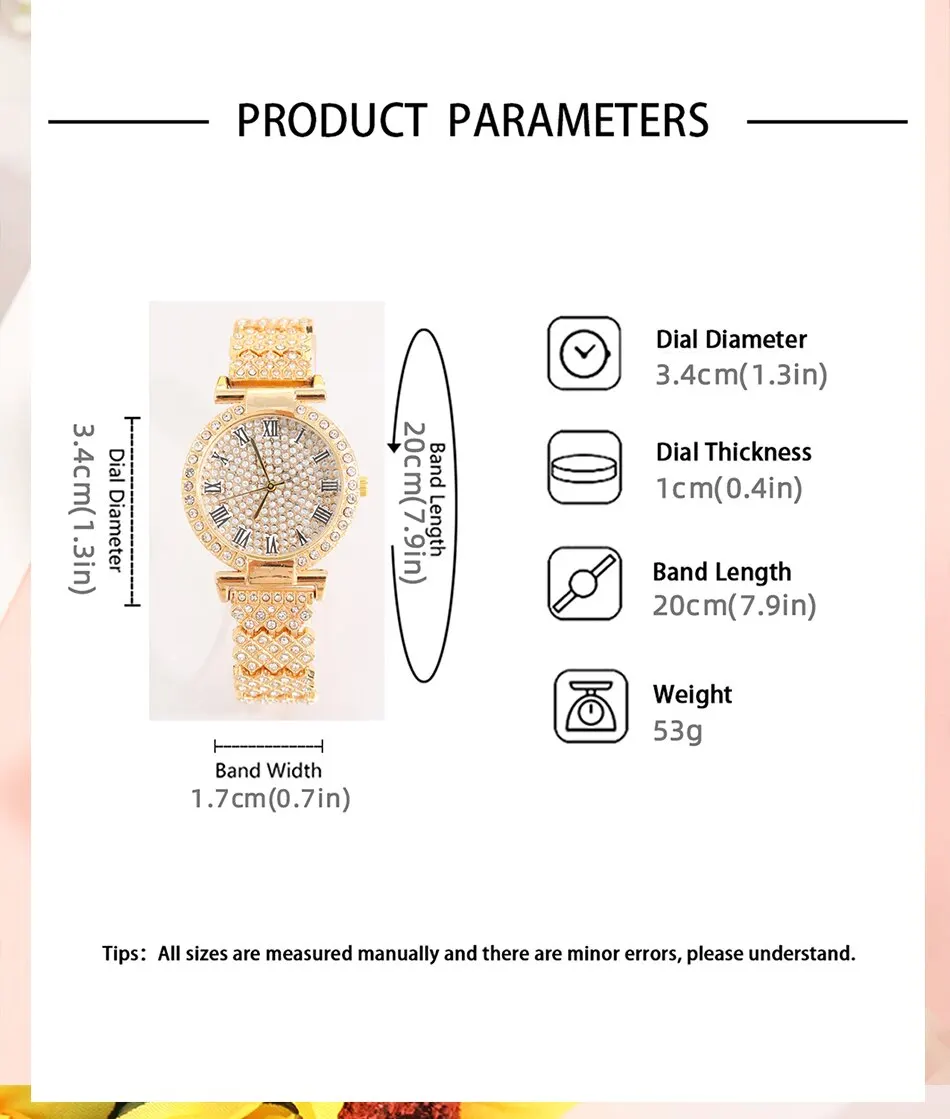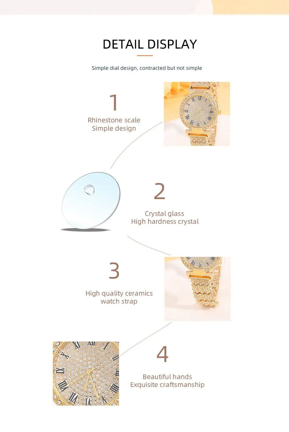 | Zircon cubique Décor | La montre présente un beau décor en zircon cubique qui ajoute une touche de luxe à n’importe quelle tenue. |