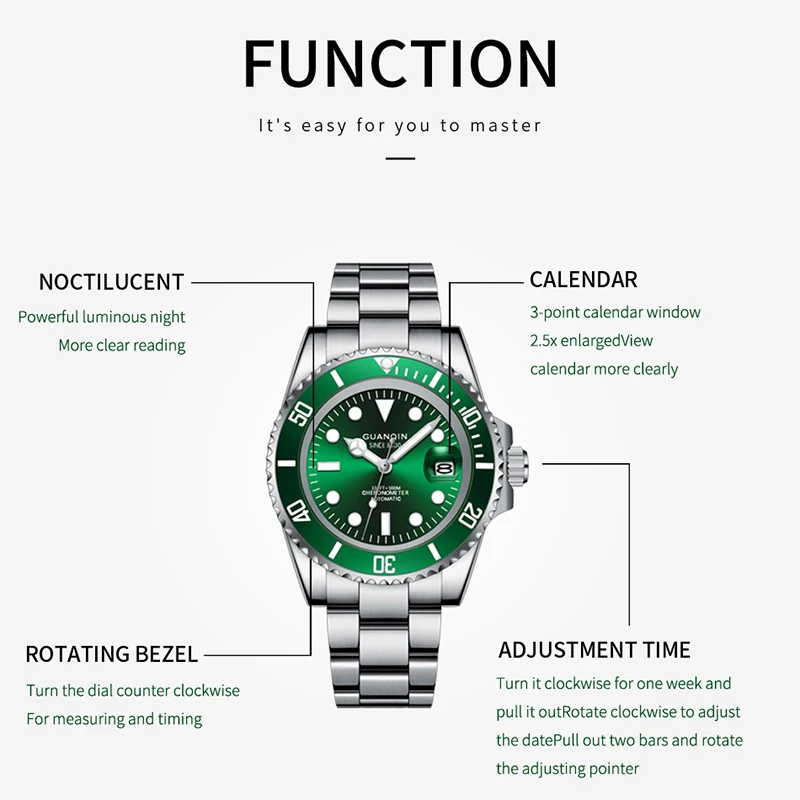 GUANQIN16192. Il est intégré avec un mouvement japonais NH35A de haute qualité, une lunette rotative en céramique, oui, une lunette en céramique, un miroir en saphir, un bouton à vis, il a donc une forte résistance à l’eau de 100m, affichage de calendrier en loupe 2,5x, sangle à boucle pliante extensible spécialement conçue, nous utilisons de l’acier inoxydable 316.