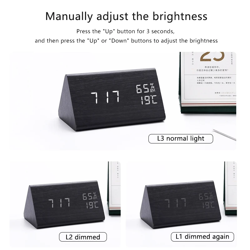 Cette horloge numérique LED en bois dispose d’une fonction de commande vocale qui permet de réveiller l’affichage lorsque la voix dépasse les 60dB. Ce contrôle du son peut être activé ou désactivé selon les besoins.