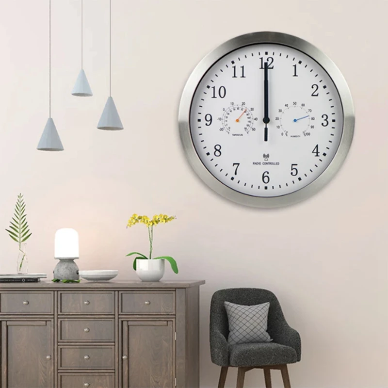 12Inch Clock Automatic Time Adjustment Scanning Radio Controlled Clock Temperature Hygrometer Wall Clock Quiet Design