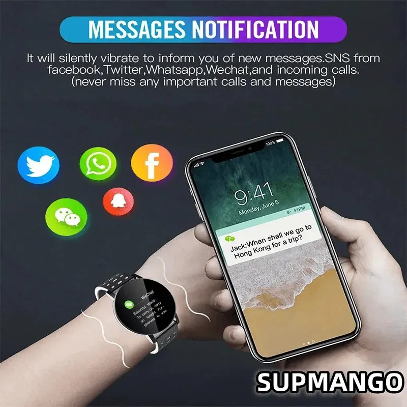 Cette montre connectée 119Plus est un accessoire polyvalent pour votre routine quotidienne. Elle dispose d’un podomètre, d’un réveil et d’un lecteur de musique.