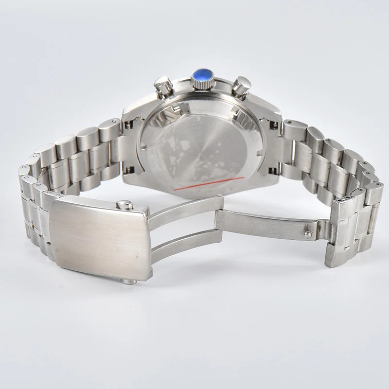La montre à quartz de luxe pour homme est dotée d’un mouvement VK63 et d’un chronographe. Elle a un diamètre de 40 mm et est modifiée par Speed-Master, avec la possibilité d’un logo personnalisé. Elle est étanche jusqu’à 5 bars. Le miroir est en verre cristal saphir et le boîtier est en acier inoxydable solide 316L. Le bracelet de montre est également en acier inoxydable massif 316L. La montre est lumineuse, avec des aiguilles lumineuses. La longueur du bracelet est de 22 cm et l’épaisseur de la montre est de 13 mm.