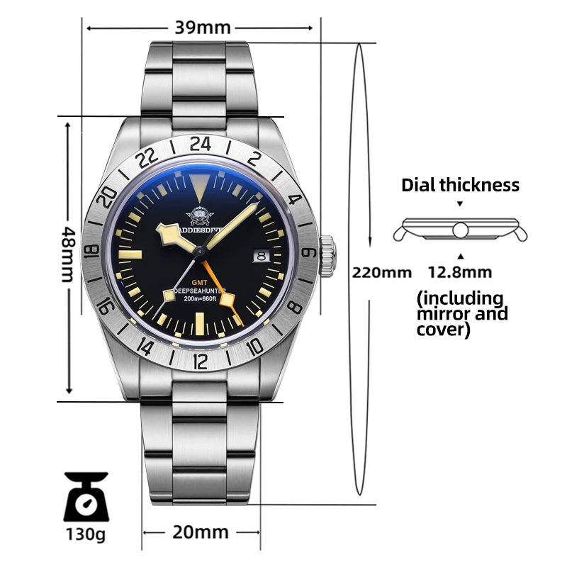 - Diamètre du boîtier de 39mm et poids total de la montre de 130g