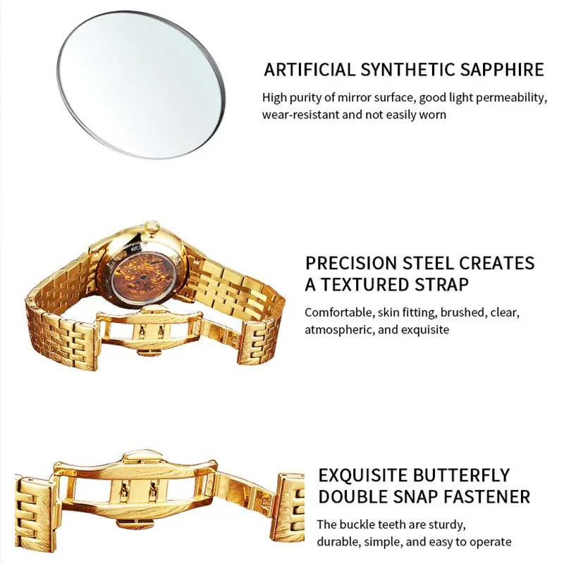 Le mouvement automatique à remontage automatique garantit également un chronométrage précis. La longueur du bracelet de montre, la largeur du bracelet de montre, le diamètre du boîtier de la montre et l’épaisseur du boîtier de montre sont tous spécifiés pour aider les clients à choisir la taille qui convient le mieux à leur poignet.