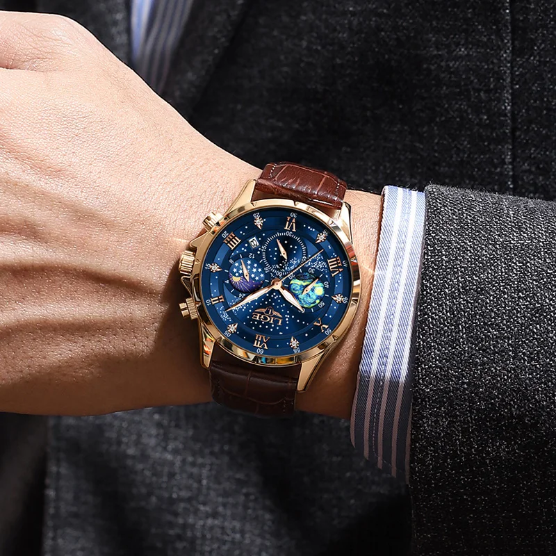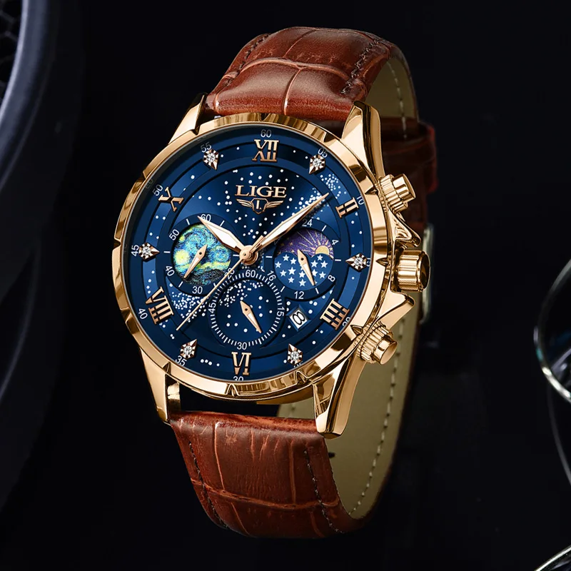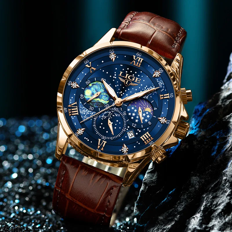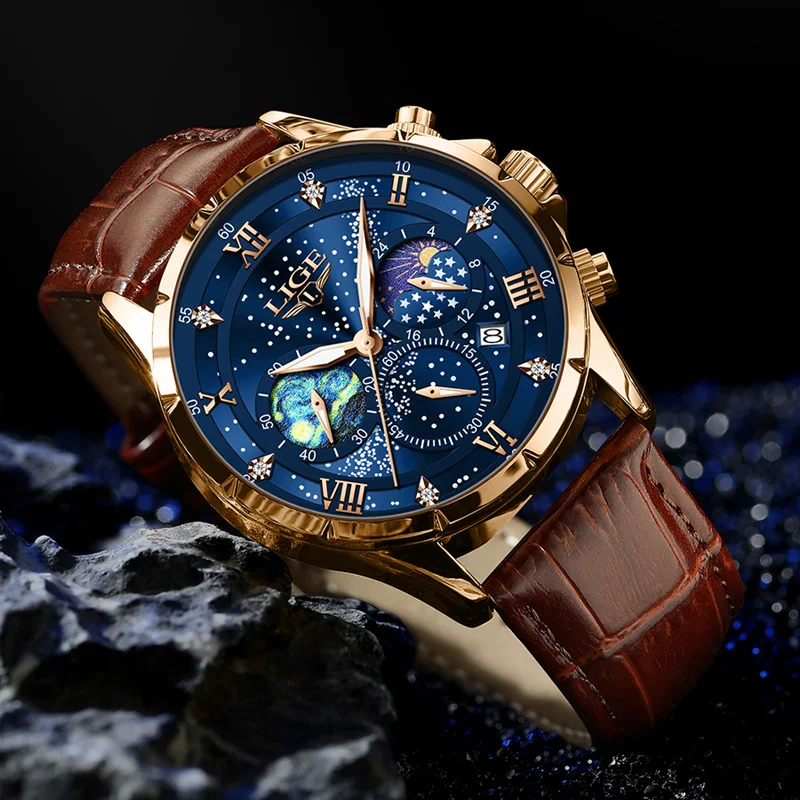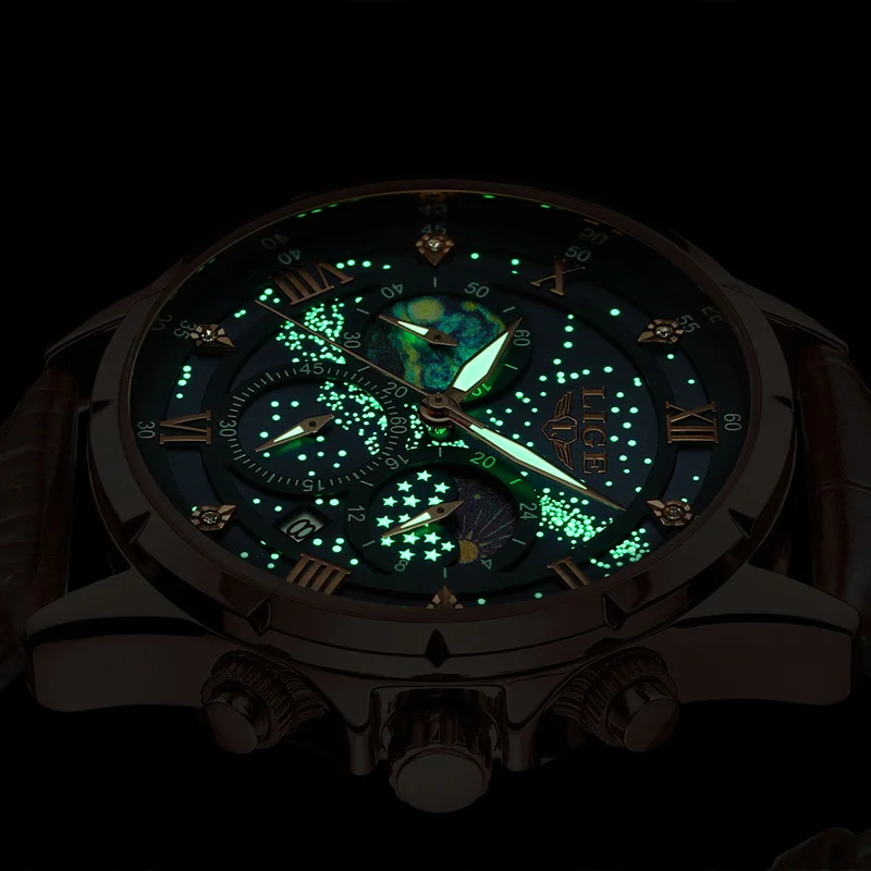 Test et avis sur la montre LIGE-Montre-bracelet à quartz Creative Night pour homme, montre-bracelet à cadran personnalisé, chronographe Shoous Star Moonswatch