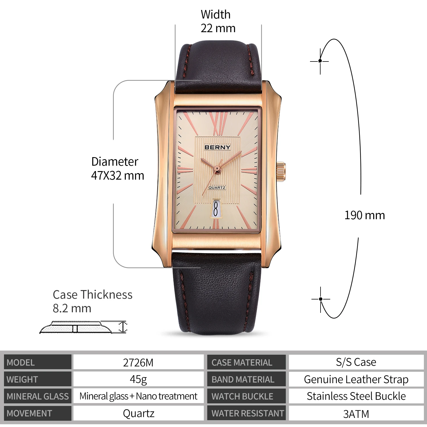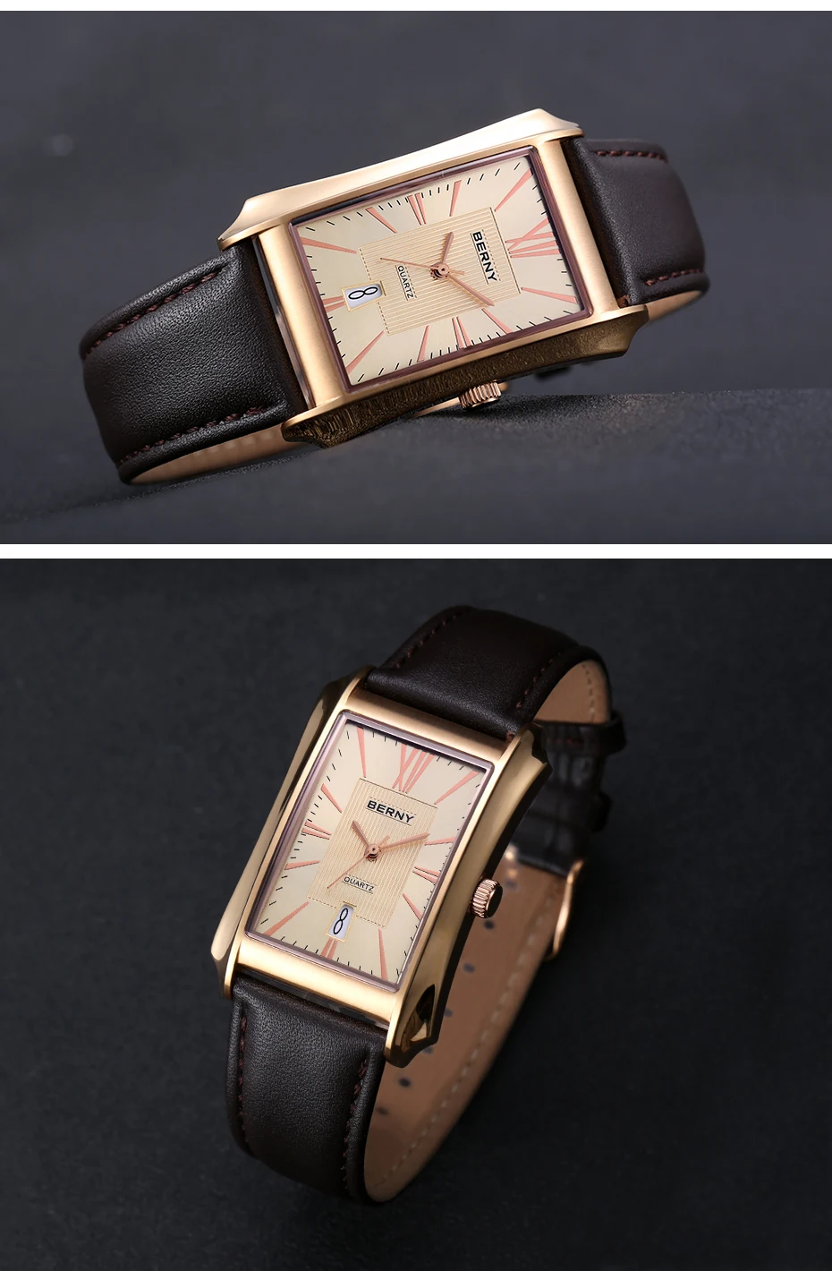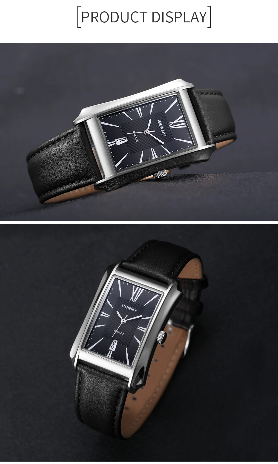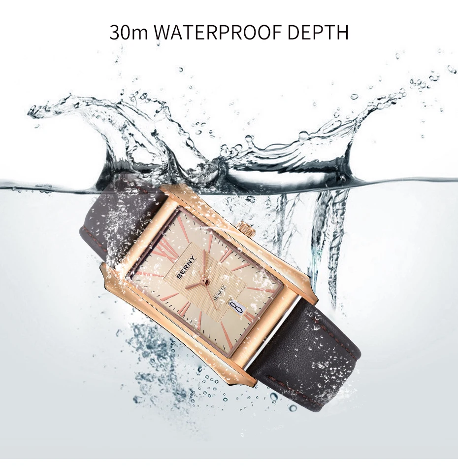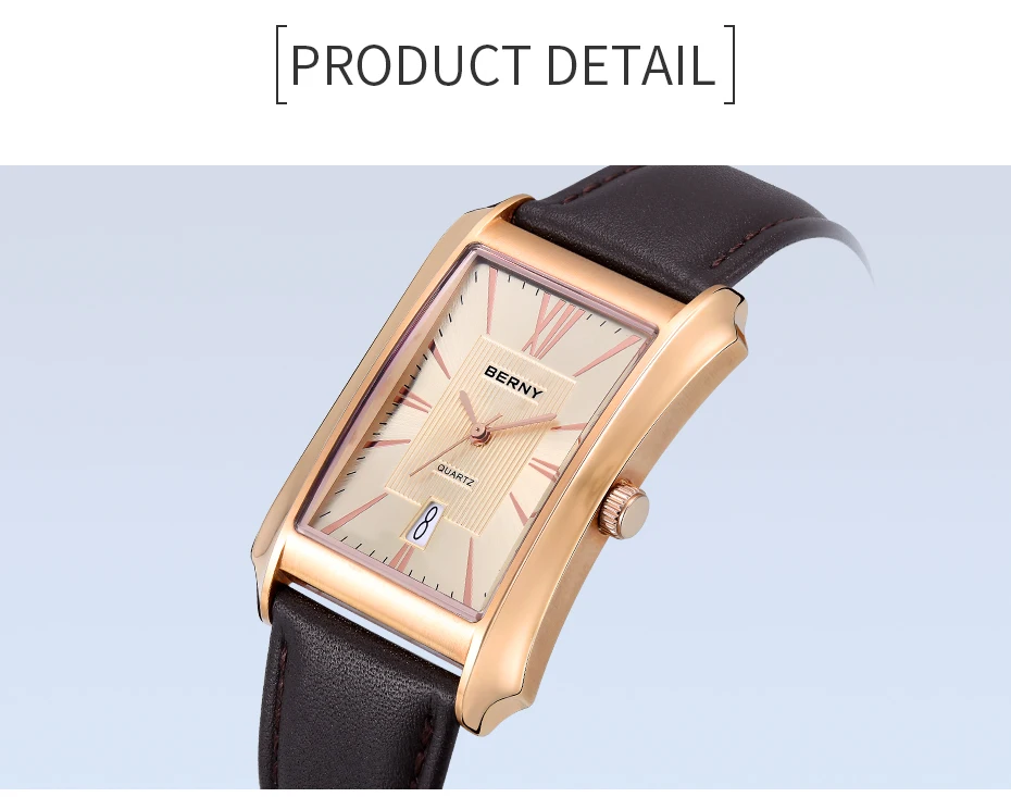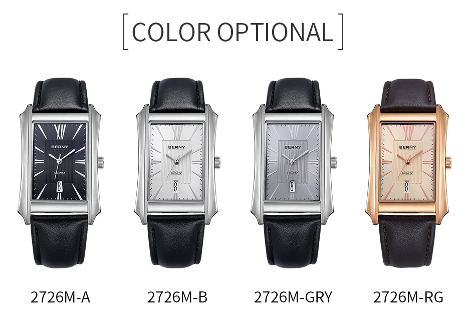 Nous pensons que la montre-bracelet rectangulaire BERNY est un choix élégant pour les hommes à la recherche d’une montre à la fois fonctionnelle et raffinée. Son design luxueux et léger en fait un accessoire polyvalent pouvant être porté au quotidien ou lors d’occasions spéciales. La fonction étanche et le mouvement à quartz SEIKO VJ42A garantissent une grande précision et durabilité. Le bracelet en cuir véritable ajoute une touche de sophistication à l’ensemble. Cependant, il convient de noter que la taille du cadran et du bracelet peut ne pas convenir à tous les poignets, il est donc recommandé de prendre des mesures avant de faire votre achat.