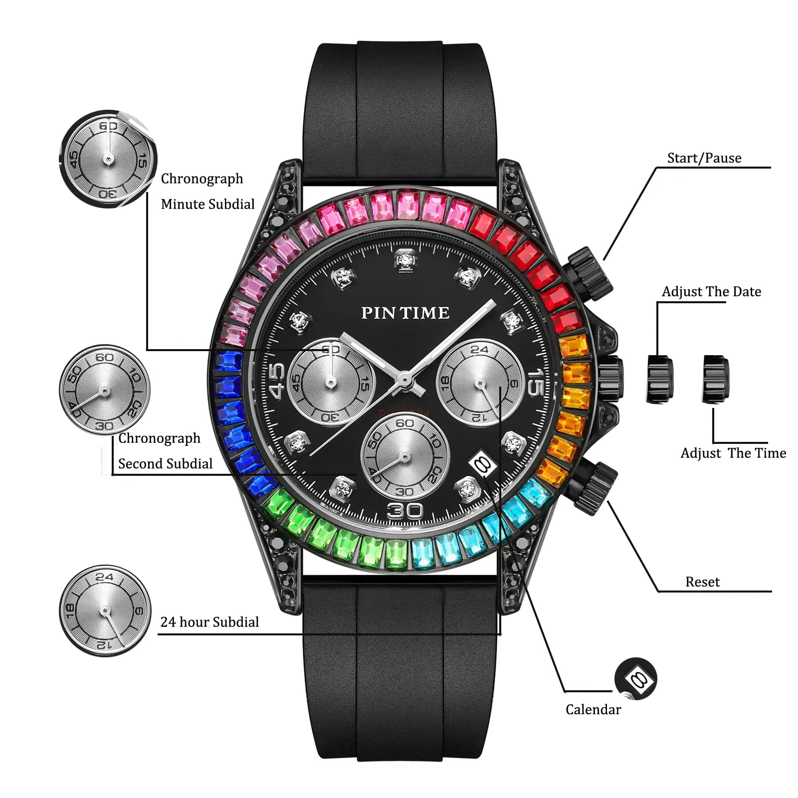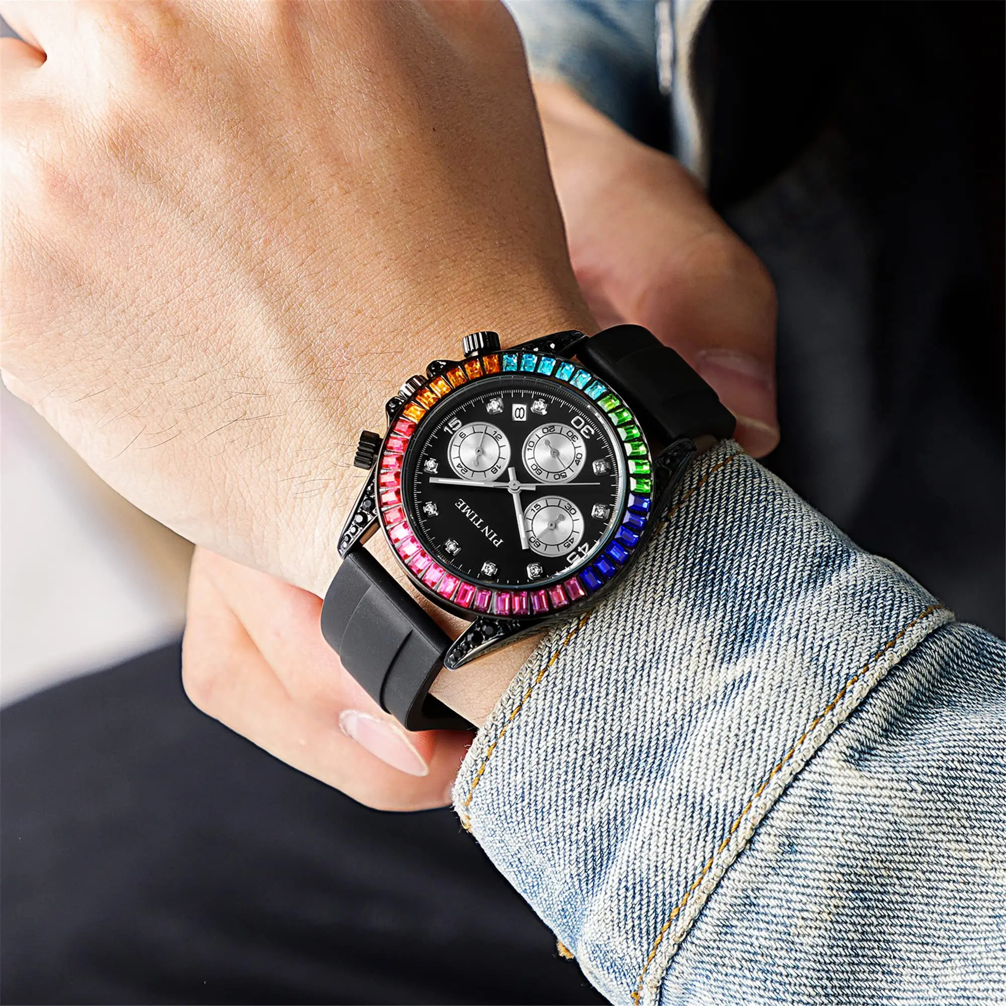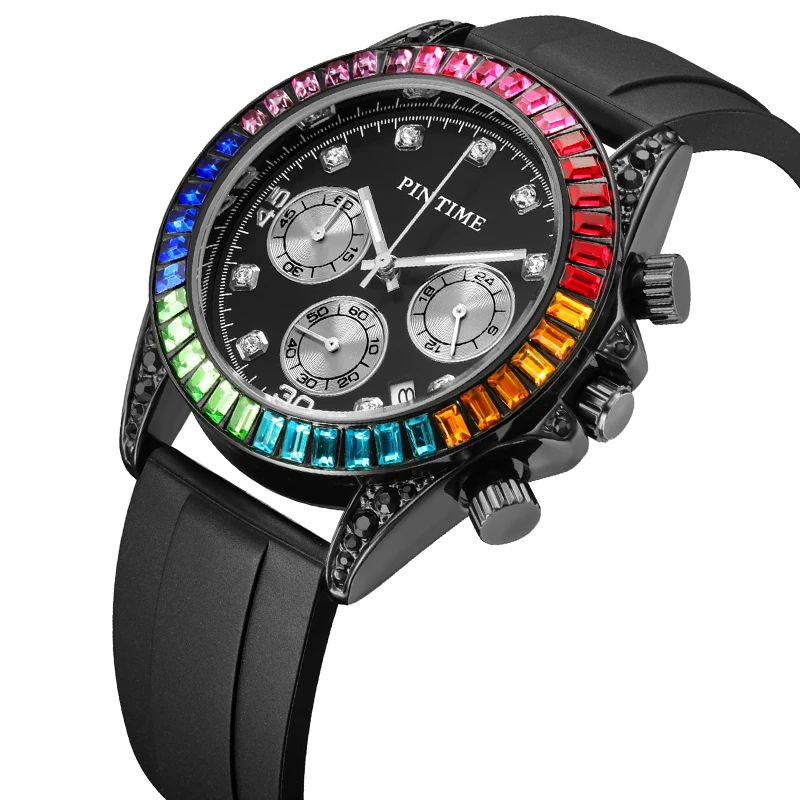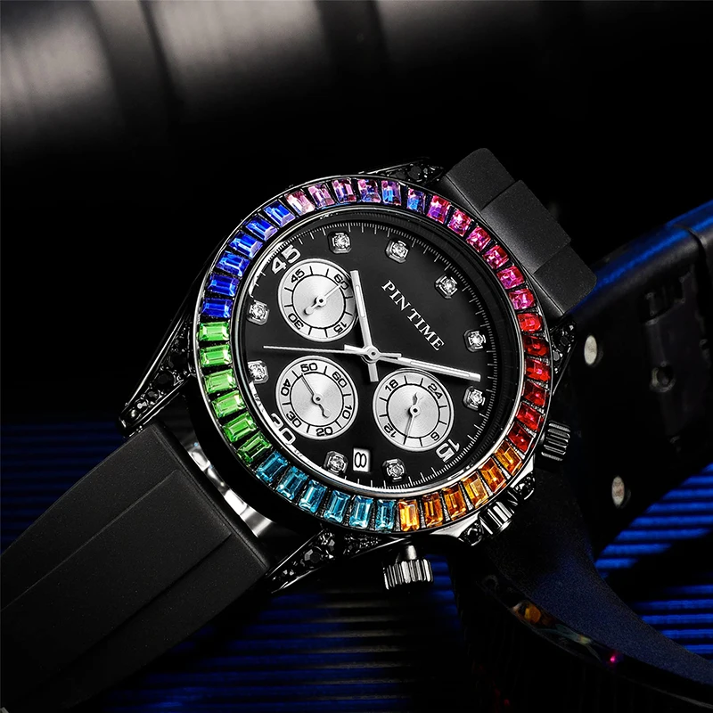 | Description du produit | Montre-bracelet étanche à quartz avec bracelet en silicone noir pour homme, chronographe classique, diamants glacés colorés, horloge de boîtier, mode, 30m |