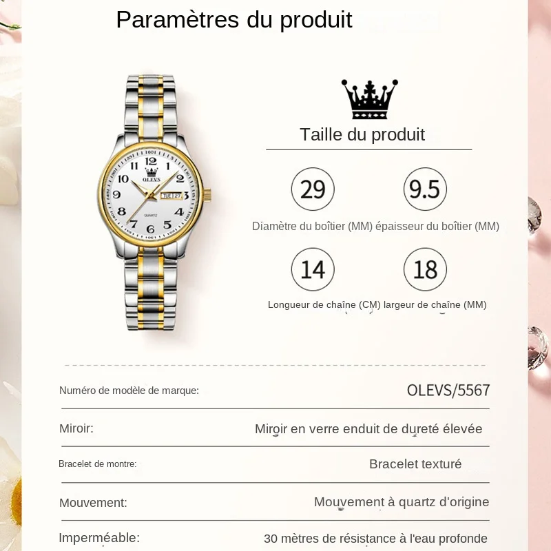 L’achat de cette montre est également accompagné d’un coffret cadeau de marque OLEVS, ce qui en fait un excellent choix pour offrir. De plus, le bracelet peut être facilement ajusté grâce à l’outil fourni, ce qui permet de l’adapter parfaitement au poignet de chaque femme.