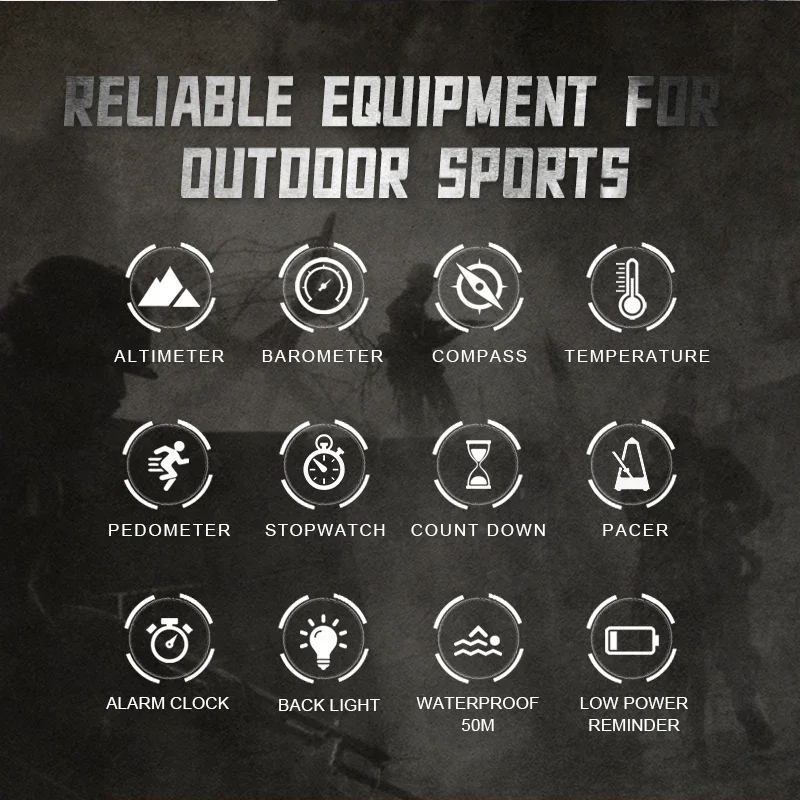 | – Altimètre (diagramme de tendance d’altitude et taux de montée) – Baromètre (graphique de tendance de pression d’air) – Boussole – Thermomètre – Prévisions météo, heure mondiale – Podomètre, nombre de pas, calories, distance d’enregistrement – Fonctions de l’heure : heure, minute, seconde, année, mois, date, jour de la semaine – Réveil (2 ensembles de réveil) – Compte à rebours – Chronomètre – Fonctions de deuxième temps – Boussole numérique d’entreprise, altimètre, baromètre, thermomètre, tendance de pression d’air et tendance d’altitude – Bouton tonalité marche ou arrêt – Durée de vie de la batterie rappeler – Rétro-éclairage EL | Étanche jusqu’à 50m |
