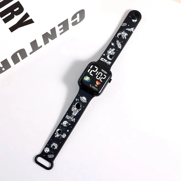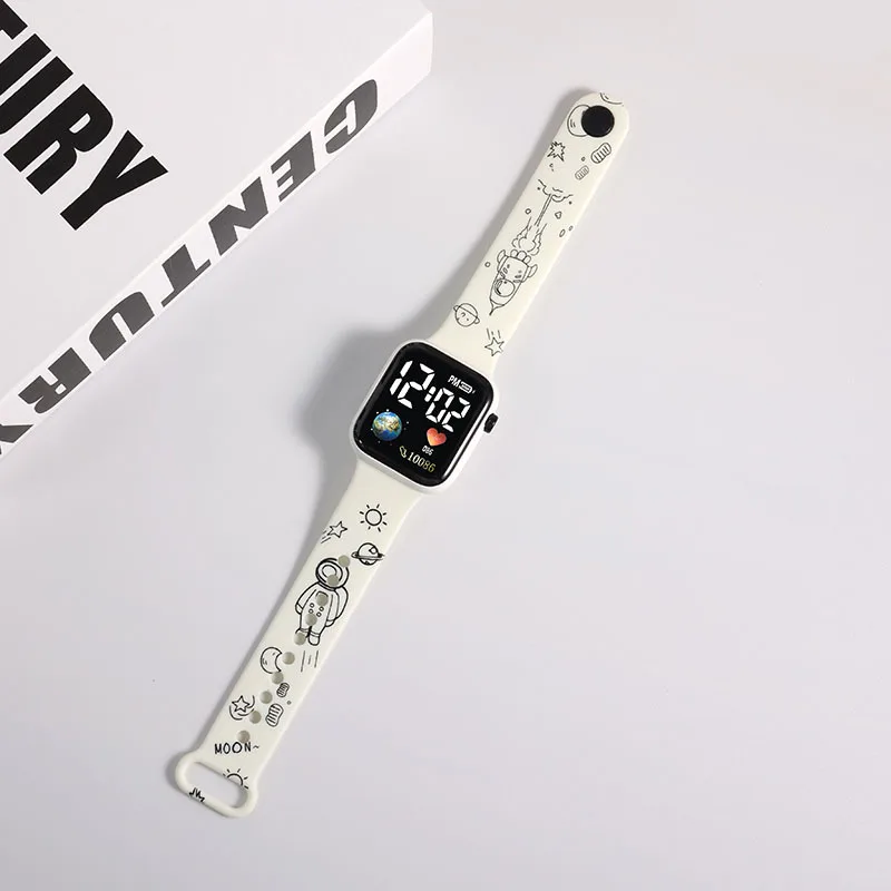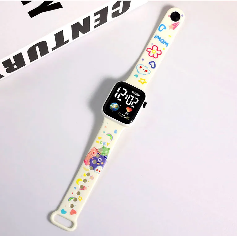 - Affichage numérique blanc incluant l’heure, la date et les secondes, ainsi que de jolis motifs de dessins animés
