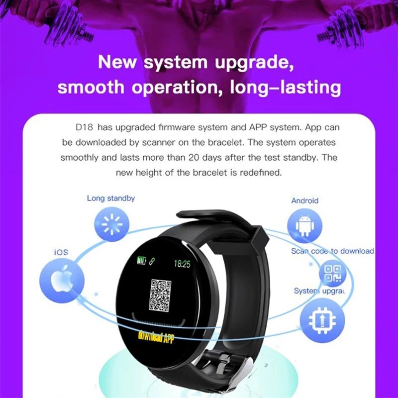 La montre connectée D18 est un bracelet numérique de fitness avec un design rond qui convient aussi bien aux hommes qu’aux femmes. Elle est dotée d’un moniteur de fréquence cardiaque, ce qui en fait un outil idéal pour surveiller sa santé et son activité physique.
