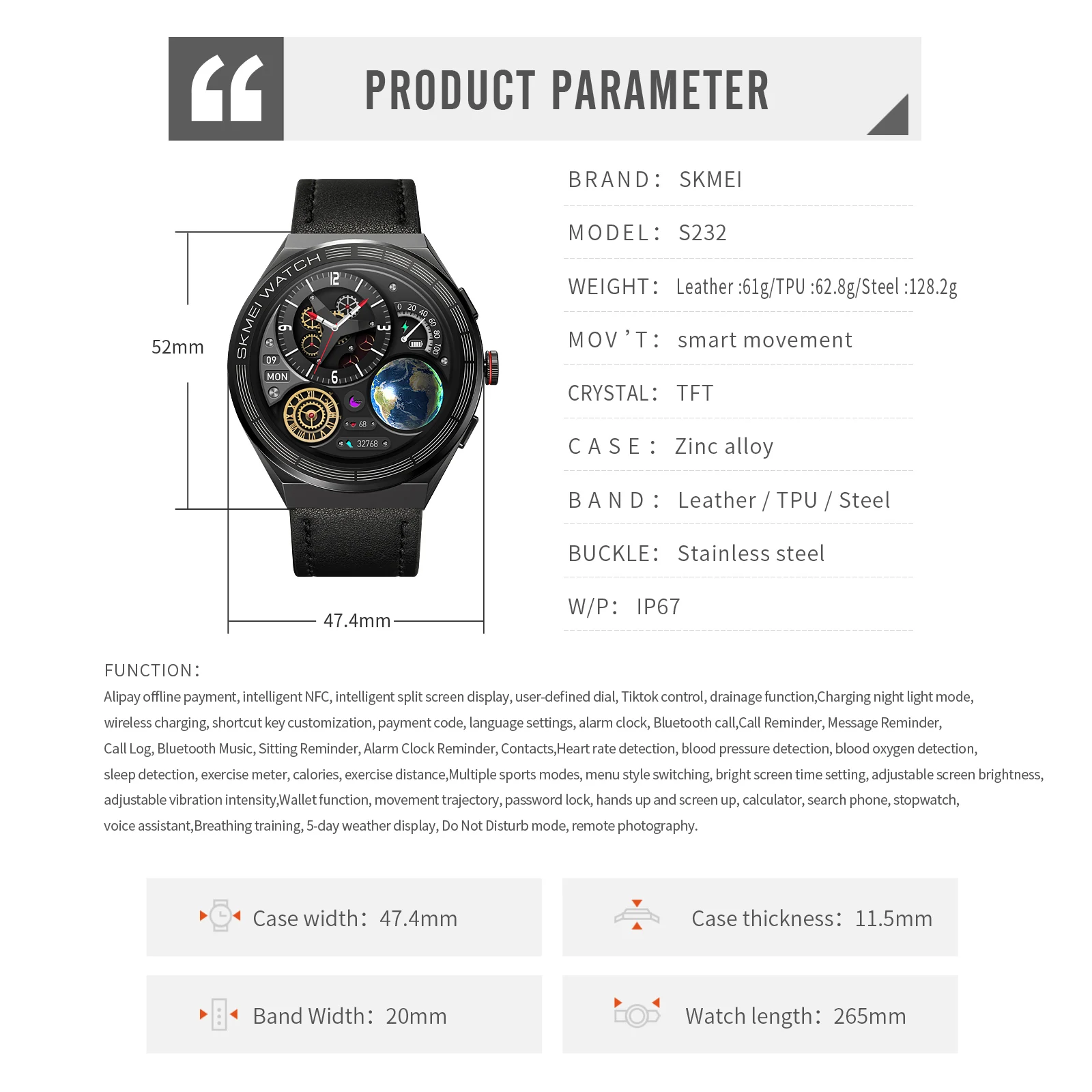 La SKMEI S232 est une montre connectée très polyvalente avec de nombreuses fonctionnalités. Son design à la mode et son écran plein offrent une expérience visuelle agréable. Grâce à la connectivité Bluetooth, vous pouvez facilement passer des appels et rester connecté à vos autres appareils.