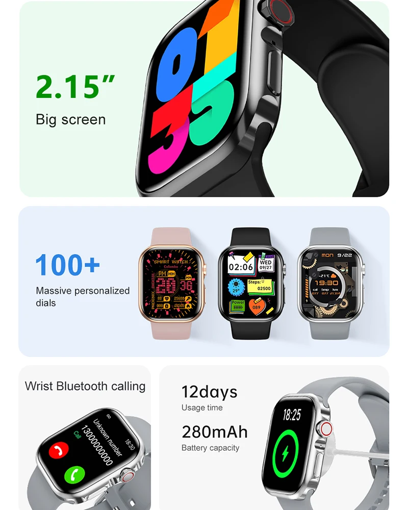 La montre connectée série 9 AMOLED offre une large gamme de fonctionnalités qui en font un choix idéal pour les amateurs de sport et les personnes soucieuses de leur santé. Avec son écran HD de 2.15 pouces, sa résolution de 240*296 et sa batterie de 280mAh, elle offre une expérience visuelle agréable et une autonomie suffisante pour une journée d’utilisation. Grâce à sa compatibilité Bluetooth 5.1, elle vous permet de passer des appels, de recevoir des notifications et de contrôler la musique directement depuis votre poignet.
