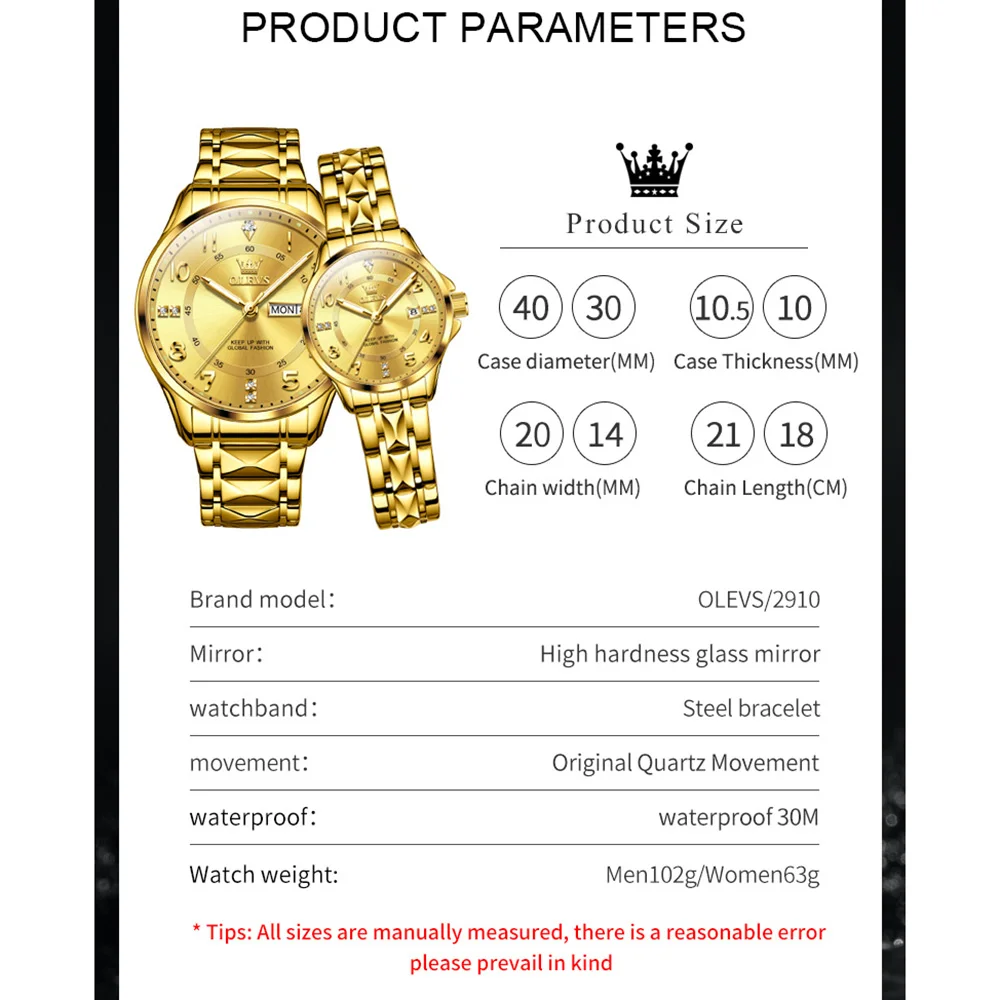 La montre OLEVS-Montre de couple à quartz de luxe classique pour hommes et femmes est un choix élégant et polyvalent. Le mouvement Quartz Original garantit une précision et une fiabilité exceptionnelles. Le bracelet en acier inoxydable ajoute une touche de sophistication, tandis que la fonction d’étanchéité jusqu’à 30 mètres assure une utilisation sans souci au quotidien. Le diamètre et l’épaisseur du boîtier conviennent parfaitement aux poignets masculins et féminins, offrant un ajustement confortable. De plus, les fonctions lumineuses, calendrier et semaine pour les hommes, et lumineuses et calendrier pour les femmes, ajoutent une fonctionnalité pratique. Dans l’ensemble, cette montre est un excellent choix pour ceux qui recherchent une combinaison de style, de qualité et de fonctionnalité.