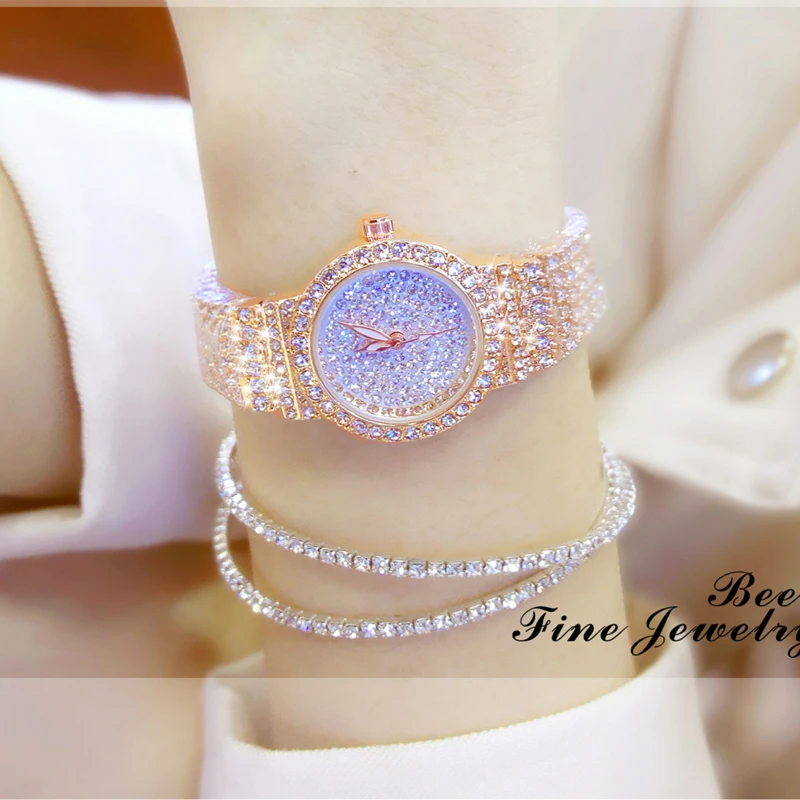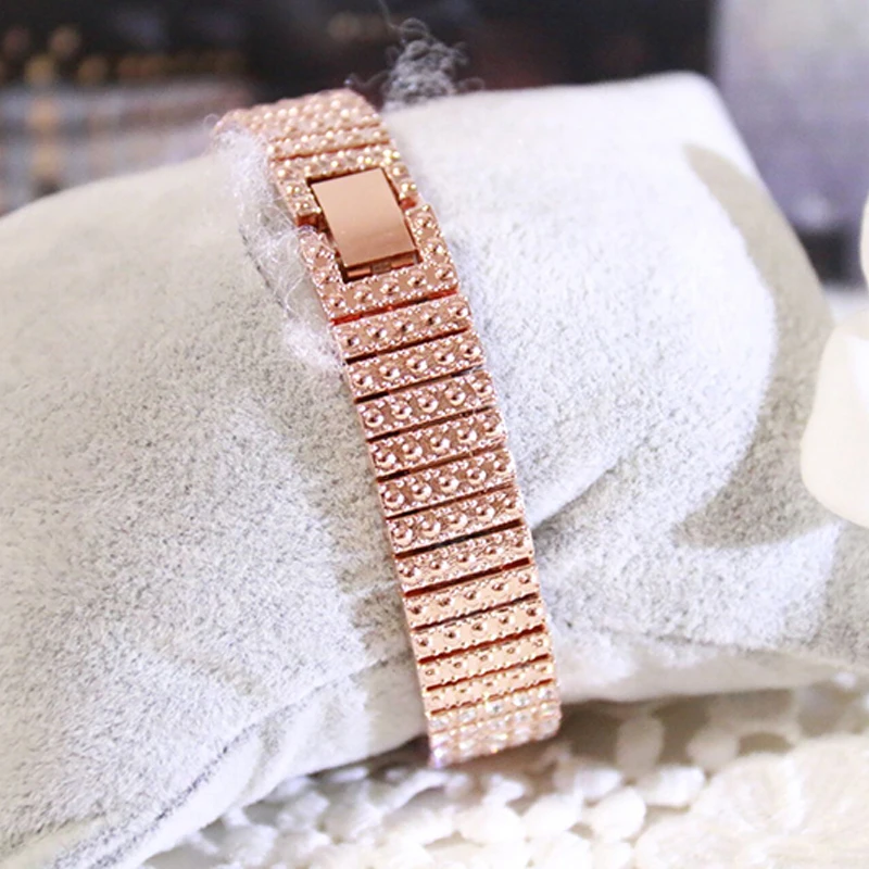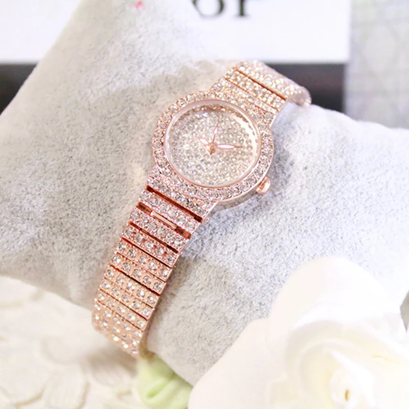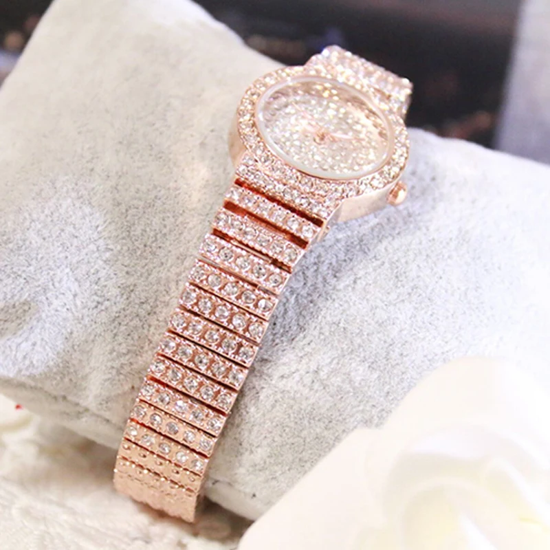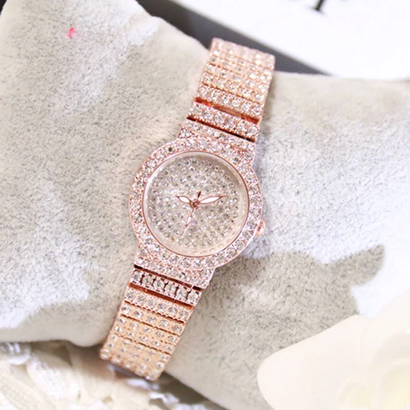 La montre de luxe pour femmes avec mouvement japonais de haute qualité et plein de diamants est un véritable bijou de mode. Son bracelet en or rose lui confère une élégance unique.