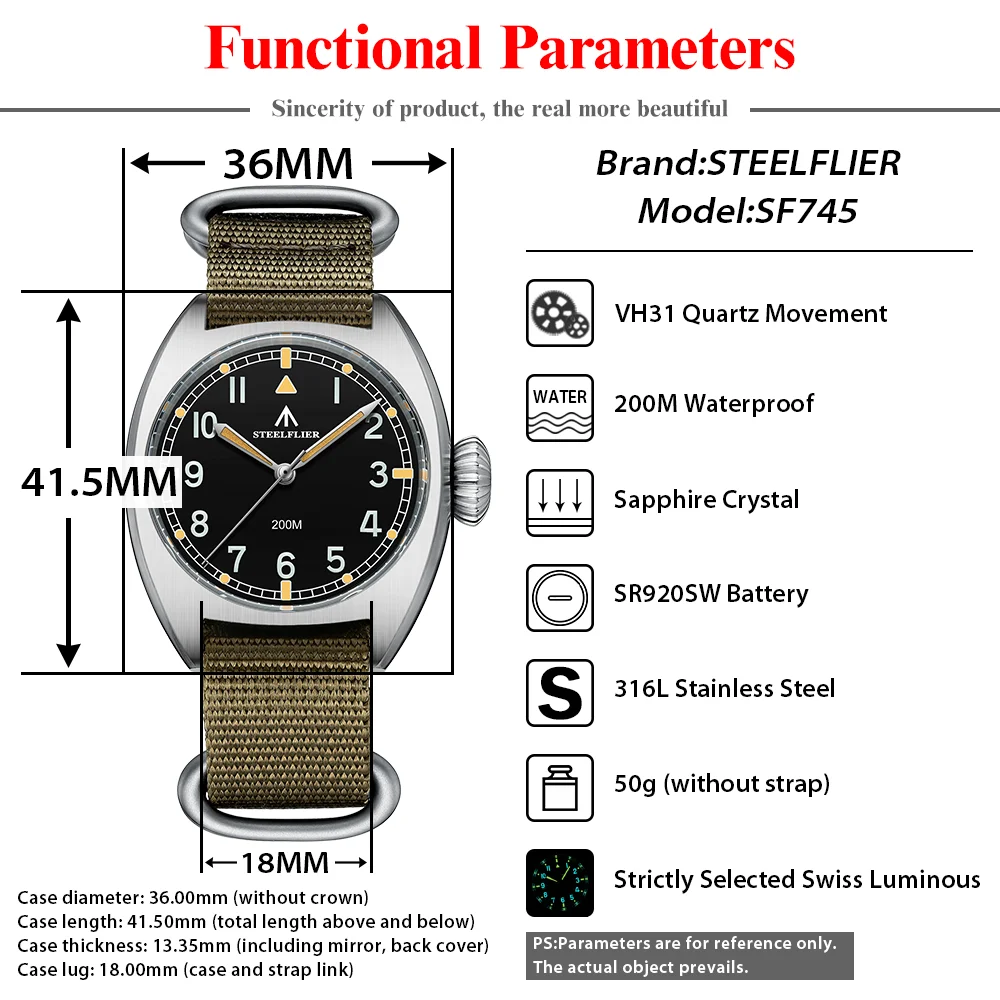 La montre STEELFLIER est une montre à quartz étanche unisexe avec un design de plongée à la mode. Elle est équipée d’un mouvement VH31 silencieux et luxueux. Avec une étanchéité de 20 bars, cette montre convient parfaitement pour la plongée. Son diamètre de 36mm (sans couronne) en fait une montre de taille moyenne, idéale pour tous les poignets. Le boîtier en acier inoxydable 316L et le miroir en saphir synthétique garantissent sa durabilité et sa résistance aux chocs. La couronne vissée à verrouillage par vis assure une étanchéité maximale. Avec ses caractéristiques lumineuses super lumineuses suisses, cette montre est parfaitement lisible même dans l’obscurité. Le package inclut également une boîte de montre étanche, un manuel utilisateur, une étiquette à accrocher et une carte de garantie.