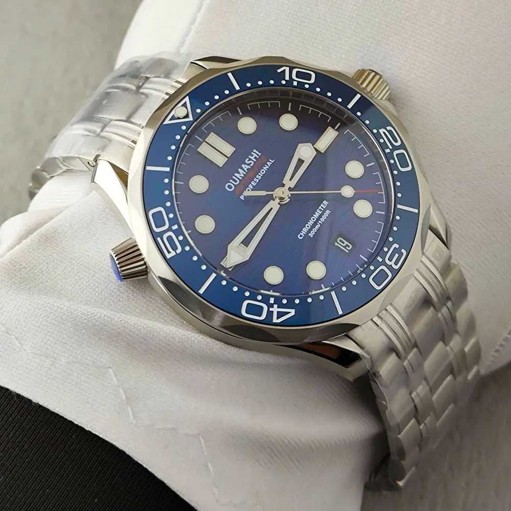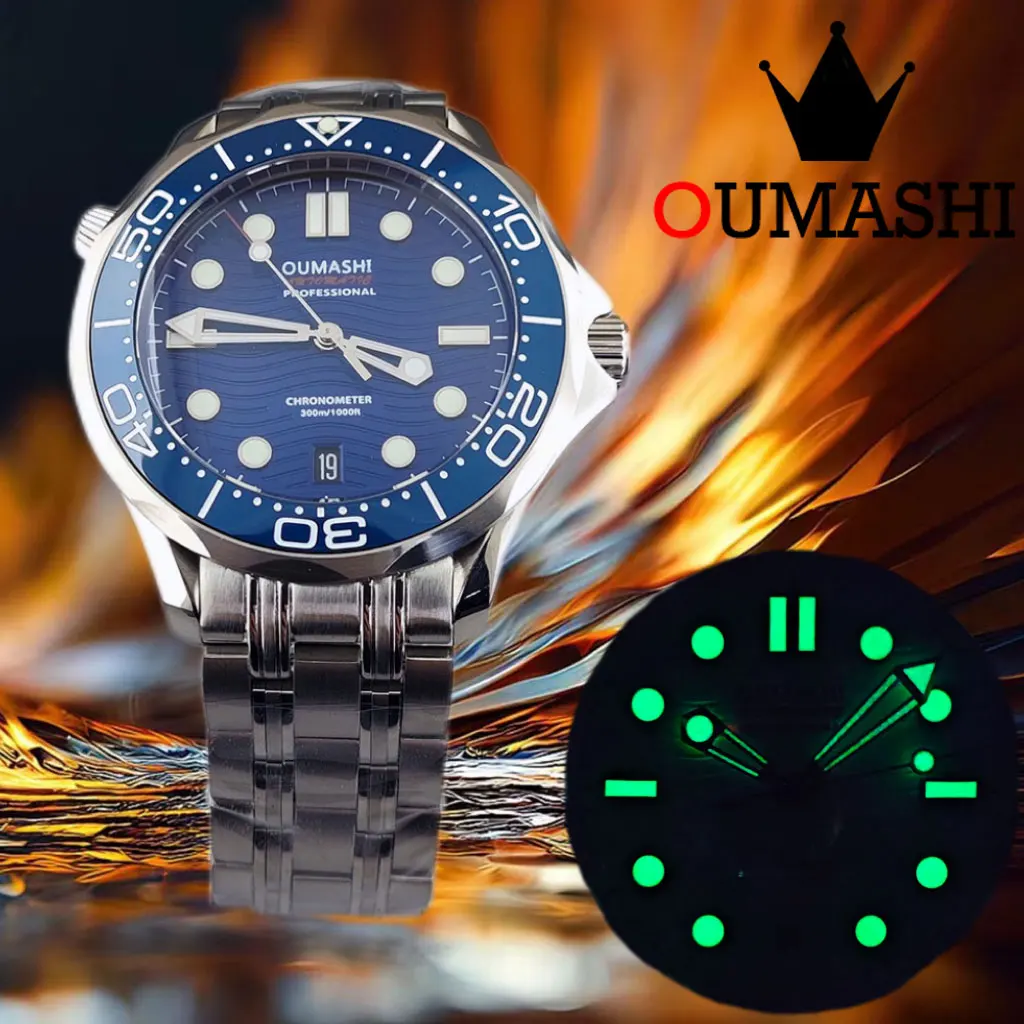 La marque OUMASHI propose une montre-bracelet mécanique de plongée pour homme, d’une profondeur de 100m. Cette montre de luxe de 42mm dispose d’un boîtier en acier inoxydable et d’une lunette en céramique, lui donnant un aspect résistant et sophistiqué.