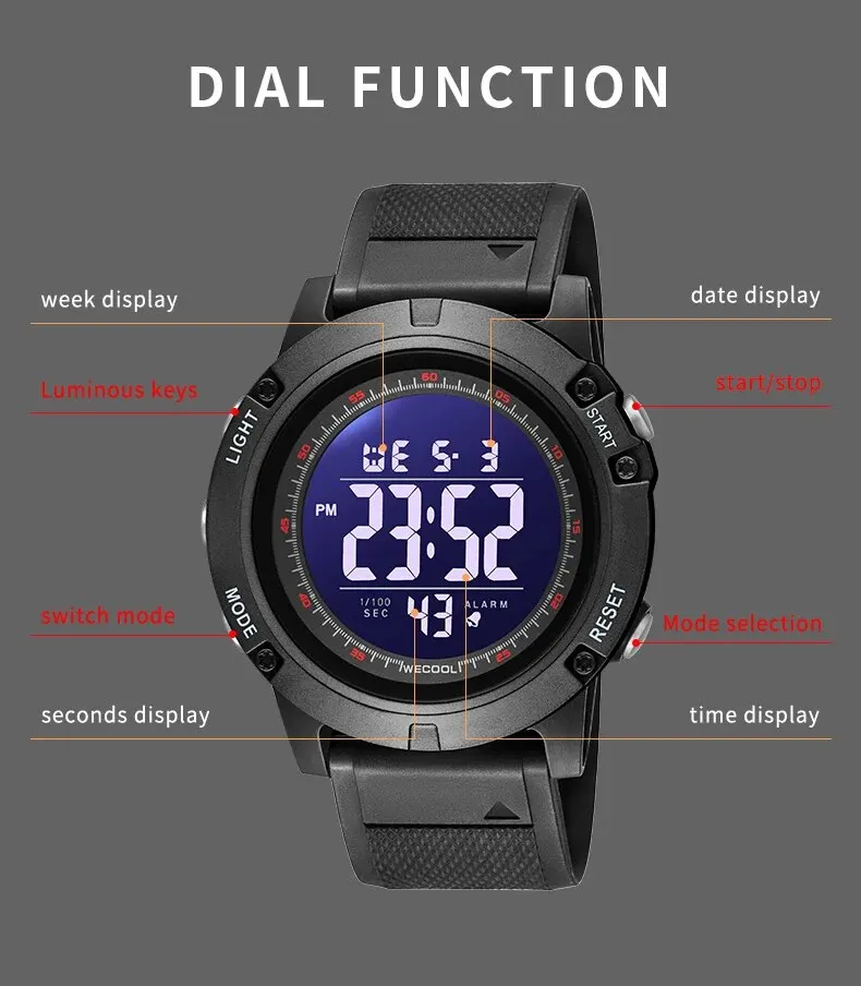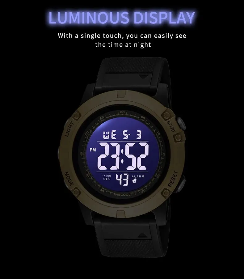 La montre WECOadvocate Marque Digtial Sports est étanche jusqu’à 50 mètres, ce qui lui permet de résister aux éclaboussures d’eau et à la pluie. Cela en fait une montre idéale pour les activités de plein air, y compris la natation.