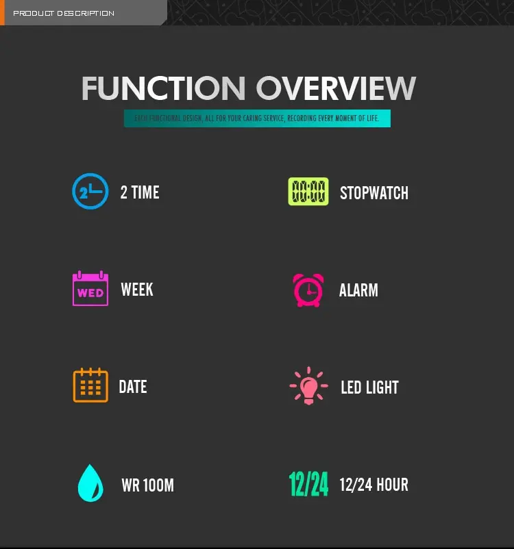 - Fonction : 2 fois, chrono, alarme, semaine, date, lumière LED, horloge 12/24 heures.