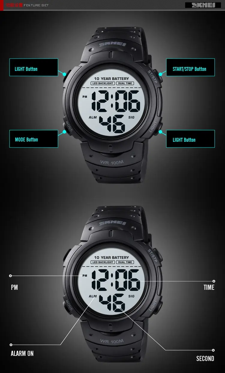 Skmei-Montre de sport numérique à affichage lumineux LED pour homme, DNono, montre-bracelet étanche, 10bar, autonomie de la batterie de 10 ans, alarme, date, horloge – Test et avis