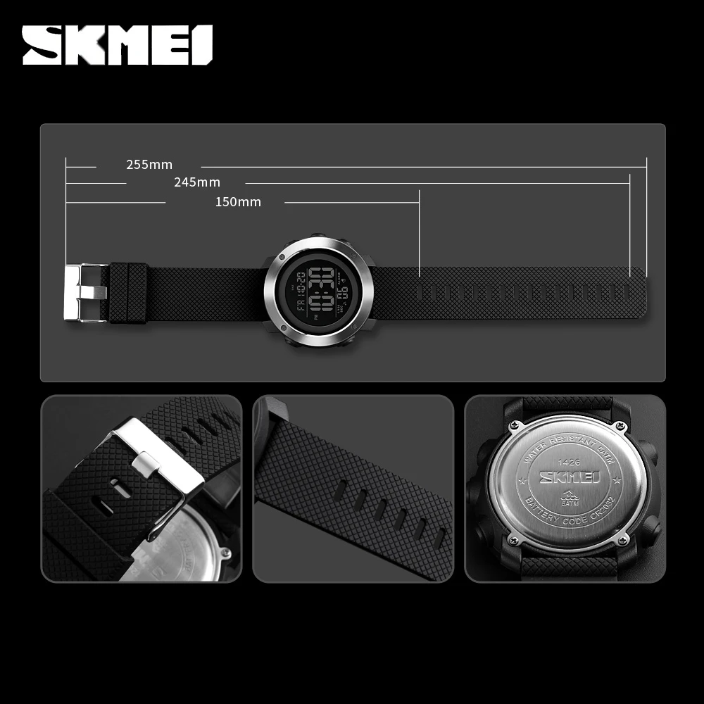 - Caractéristique: 50M résistant à l’eau, résistant aux chocs, calendrier complet, chronographe, Affichage de la semaine, affichage LED, double temps, compte à rebours
