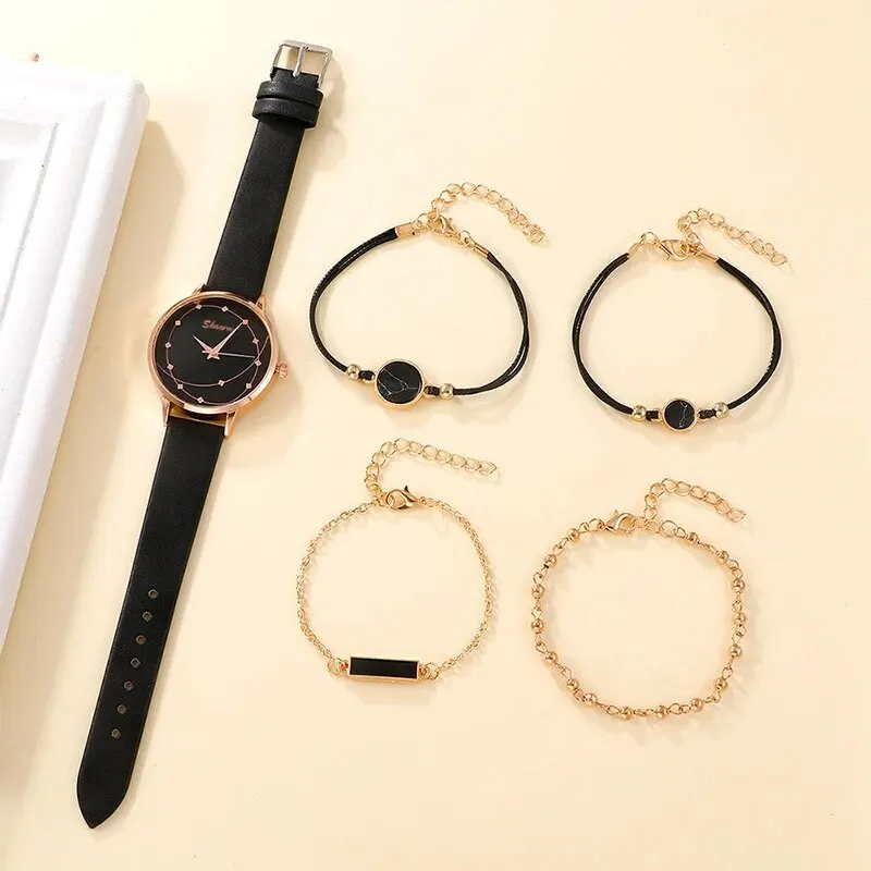 La montre « 5pcs Set Femmes Mode Montre Casual Ceinture En Cuir Montres Dames Ciel Étoilé Cadran Quartz Montres Robe Horloge Reloj Mujer » comprend plusieurs caractéristiques intéressantes :