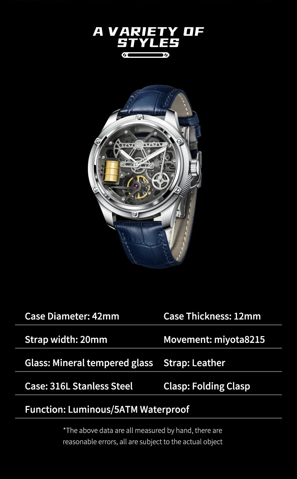 La montre en verre saphir pour homme, design pindu, est une montre de marque supérieure. Elle est équipée d’une machine horloge d’affaires ATA Yota 2024 + boîte 8215. Le mouvement a été modifié pour offrir des fonctionnalités avancées. Le boîtier en verre haute résistance est fabriqué en acier inoxydable 316L, garantissant ainsi une durabilité maximale. La montre est disponible avec un bracelet en cuir, en acier inoxydable ou en maille, selon les préférences de chacun. Elle est également étanche jusqu’à 50 mètres, ce qui la rend adaptée aux activités nautiques.