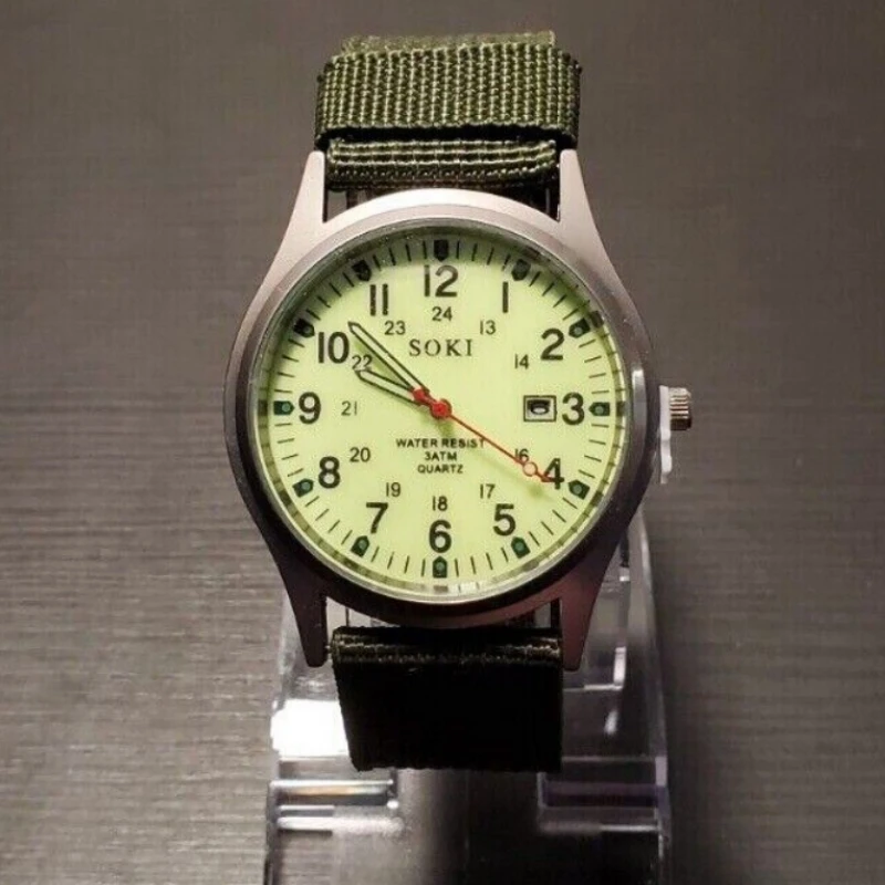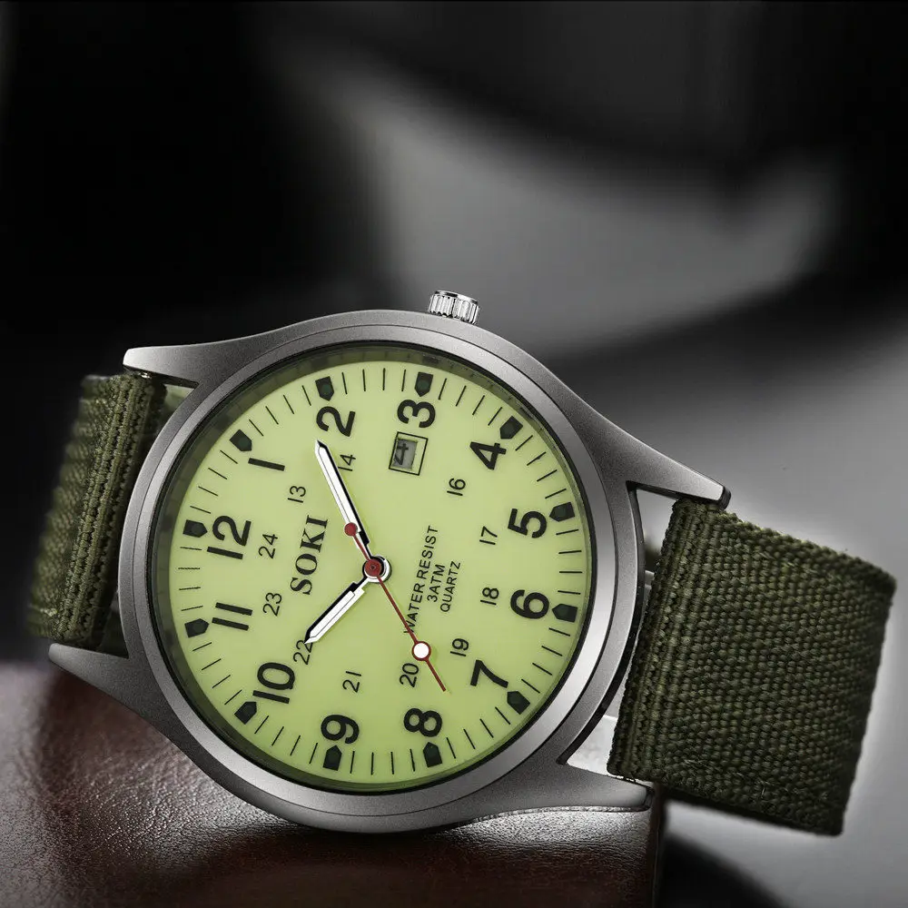 Le produit SOKI est une montre lumineuse en nylon spécialement conçue pour les hommes. Son bracelet militaire lui confère un style décontracté et sportif, idéal pour les activités en plein air.