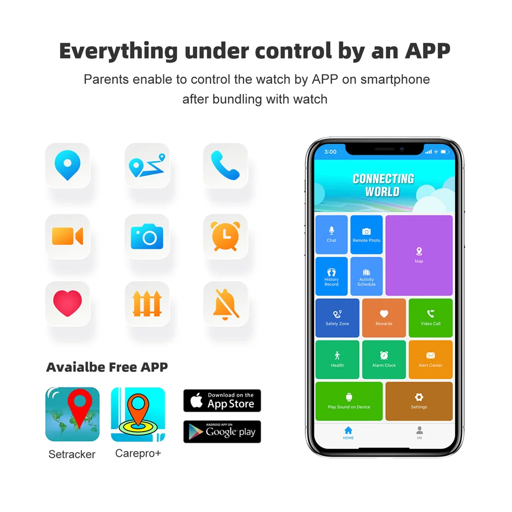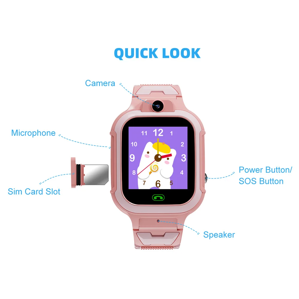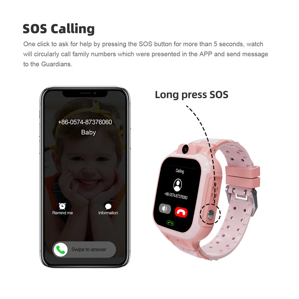 - Autres caractéristiques : clôture électronique (GEO), suivi de l’historique, réveil, trouver une montre, annuaire téléphonique, mode de fonctionnement, montre d’arrêt à distance, prise en charge de l’application pour smartphone Android et iOS