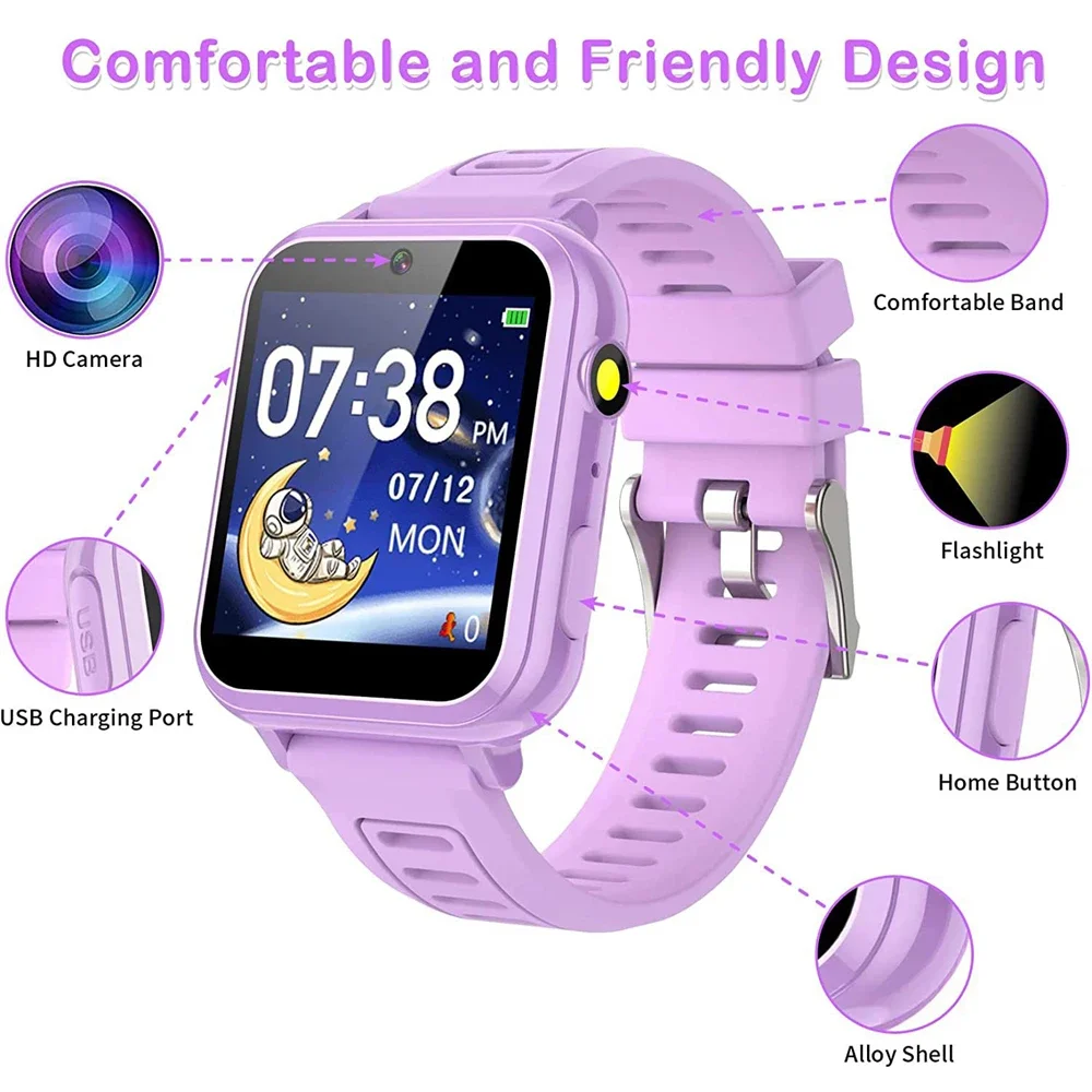 | Caractéristiques | Montre intelligente avec 24 jeux de puzzle, montre-bracelet de sport pour enfants, podomètre, réveil, lecteur de musique, appareil photo, torche |