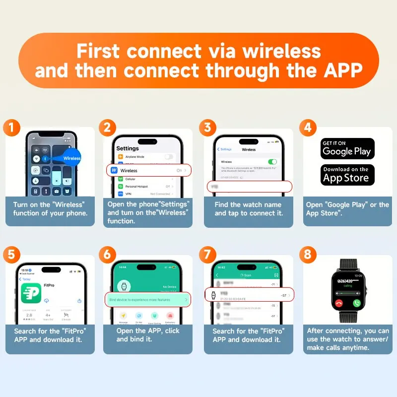 Note: Après avoir reçu la montre, veuillez la charger d’abord, car après une longue période de logistique, la montre sera faible en puissance. Avant d’utiliser, veuillez scanner le code QR sur le manuel pour télécharger l’application et utiliser l’application pour vous connecter à la montre.