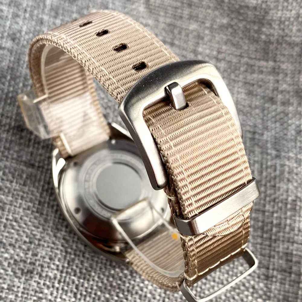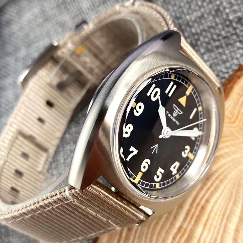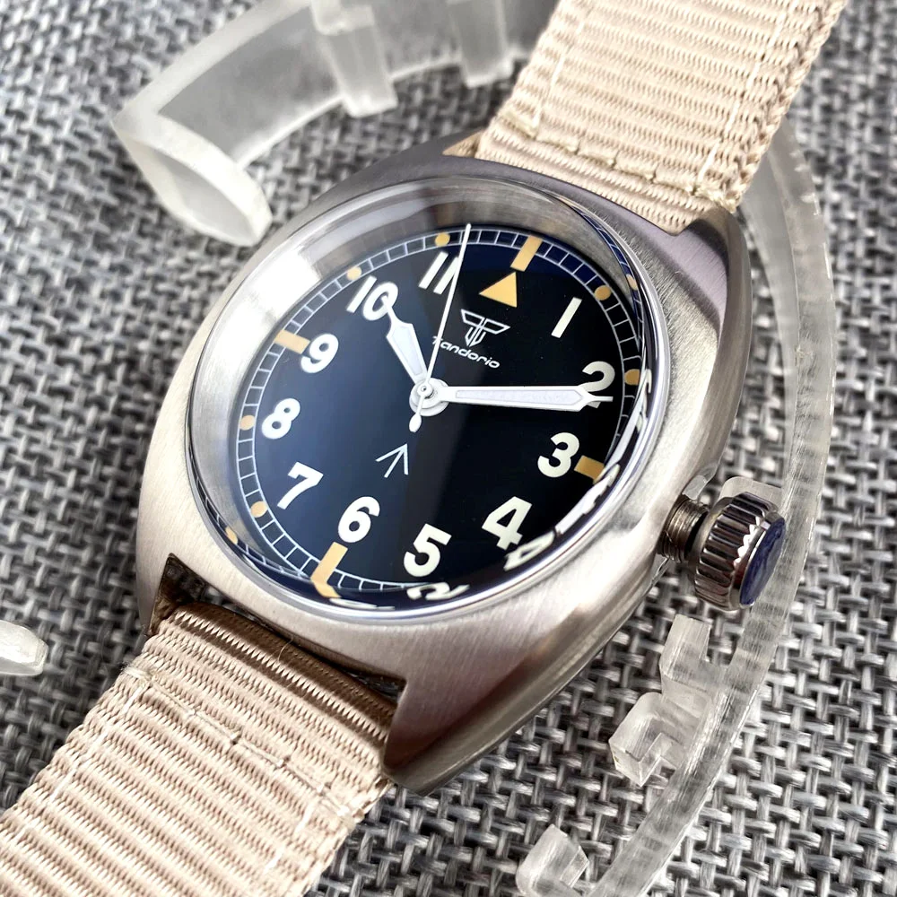 La Montre Mécanique Tandorio pour Homme est une petite montre-bracelet de style pilote avec un bracelet en nylon. Elle a un cadran noir avec des marqueurs lumineux verts. Le boîtier a un diamètre de 36mm sans couronne et une épaisseur de 14mm. Il est fait en acier inoxydable 316L solide. La montre a une résistance à l’eau de 200m. Le bracelet est en nylon gris/noir/kaki d’une largeur de 18mm. Le verre est en saphir AR bombé. Les marques et les aiguilles de la montre sont lumineuses. La montre a également une patte à crampon de 41.5mm. Il est possible de personnaliser le logo de la montre (cadran, couronne, fond du boîtier, sangle), mais des frais supplémentaires peuvent s’appliquer. La montre est également livrée avec une option de main d’échange et de cadran personnalisé.