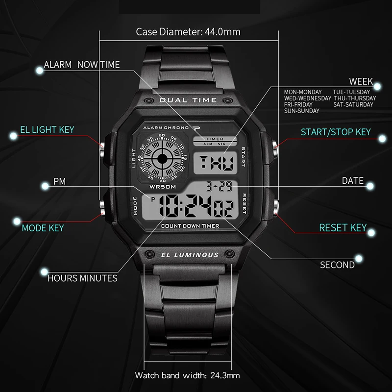 - Montre multifonction avec chronomètre, réveil, rappel horaire, affichage de la date, affichage de l’heure, affichage de la semaine, conversion de 12/24 heures et étanche.