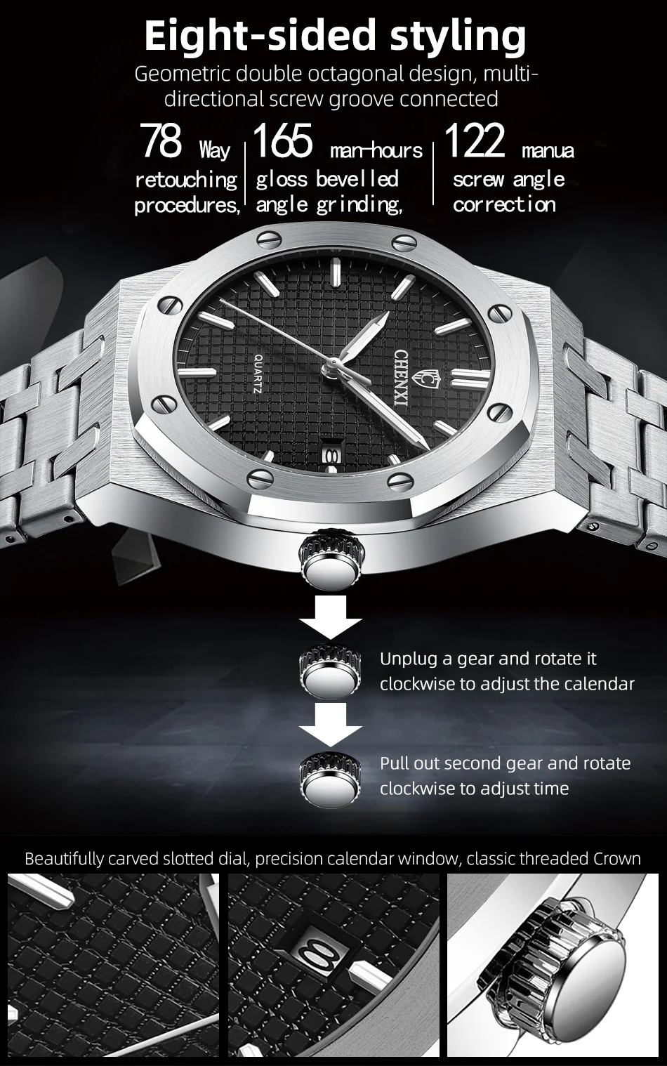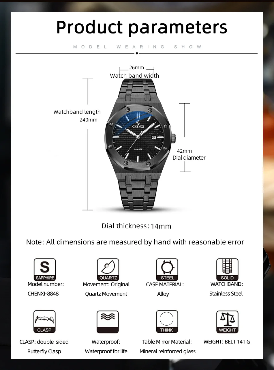 La montre CHENghts-Montre Shoous est une montre pour homme en acier étanche. Elle est dotée d’un mouvement à quartz japonais précis, garantissant un chronométrage précis. Son design tendance en fait un accessoire de mode idéal. La montre est résistante à l’eau jusqu’à 3 ATM, ce qui la rend parfaite pour le lavage des mains, la transpiration et la pluie, mais elle ne peut pas être immergée dans l’eau ou utilisée sous la douche ou pour la natation. La livraison est gratuite et la montre est emballée sans boîte cadeau. C’est un excellent cadeau pour la famille, les amis, les amoureux ou vous-même.