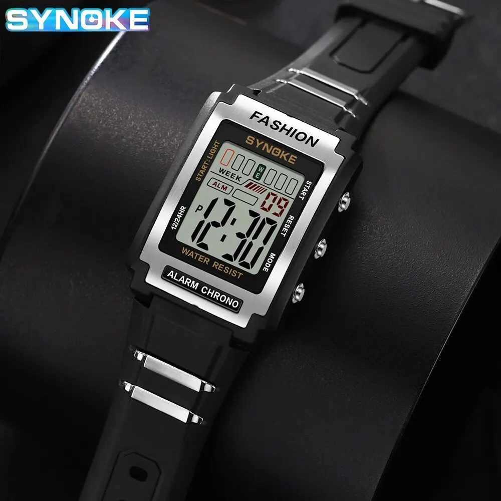 Test et avis sur la montre SYNOKE Hommes Rectangulaire Sport Montre Électronique Étanche 50M Night Light Grand Écran Réveil Tendance Rétro Style