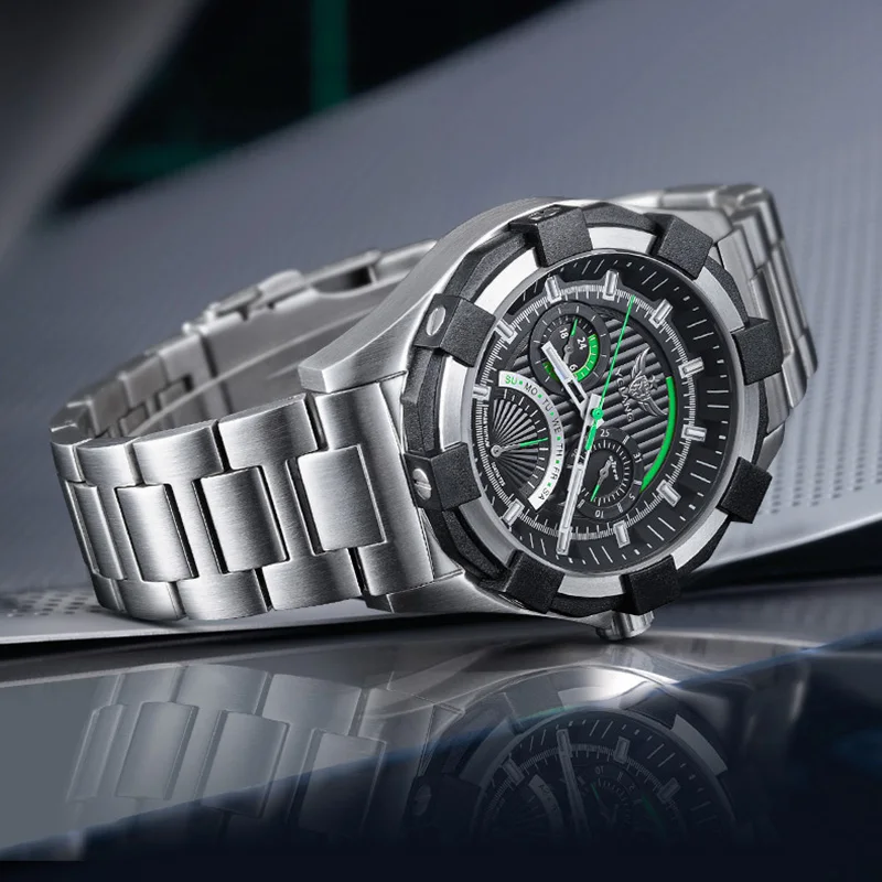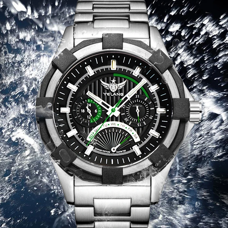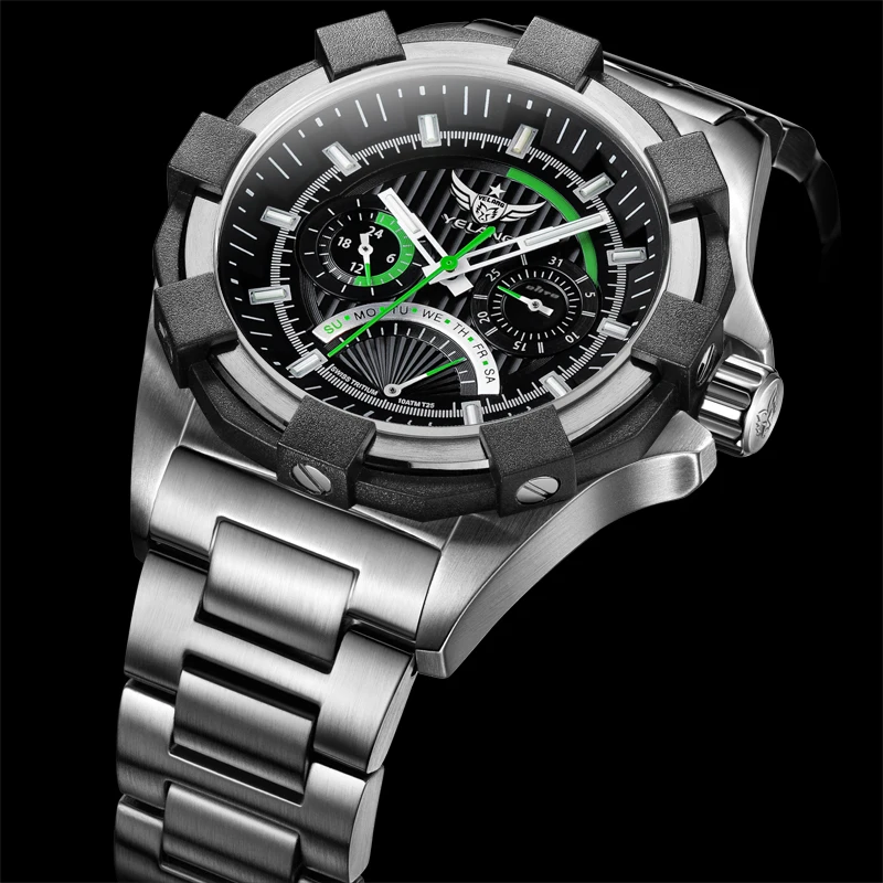 La montre Yelang se distingue par son design sportif et tendance, avec un boîtier en acier inoxydable de 45.5mm de diamètre. La qualité de construction est excellente, avec un bracelet en acier inoxydable massif 316L qui assure une grande durabilité.