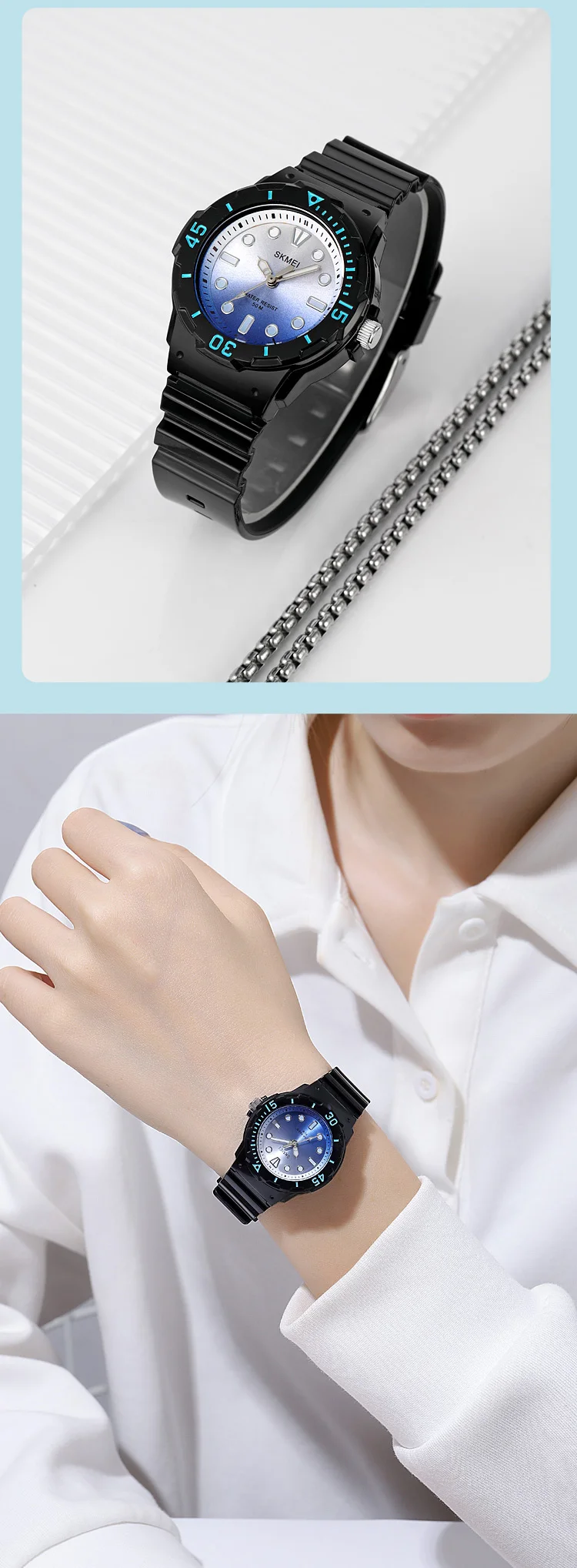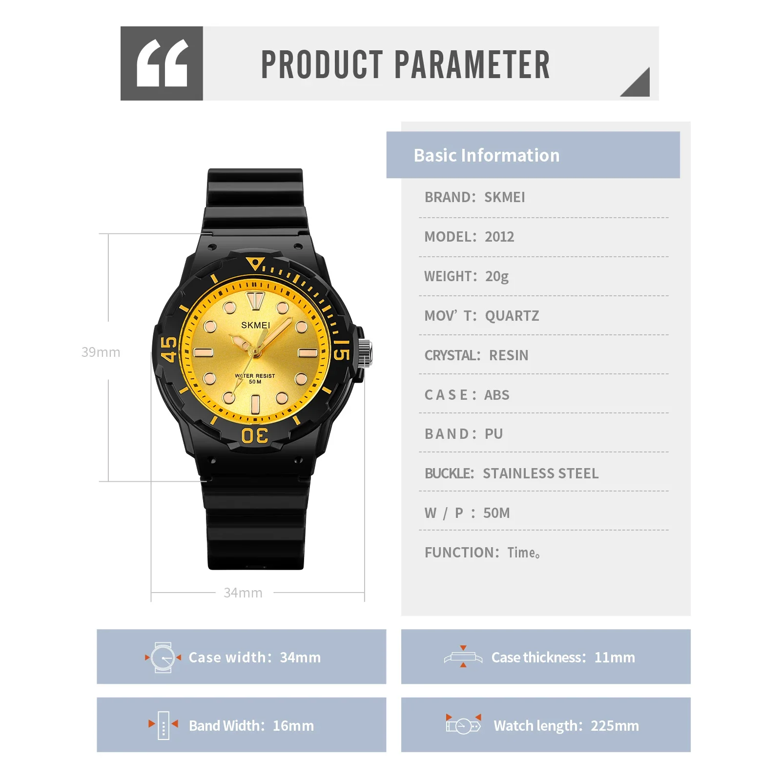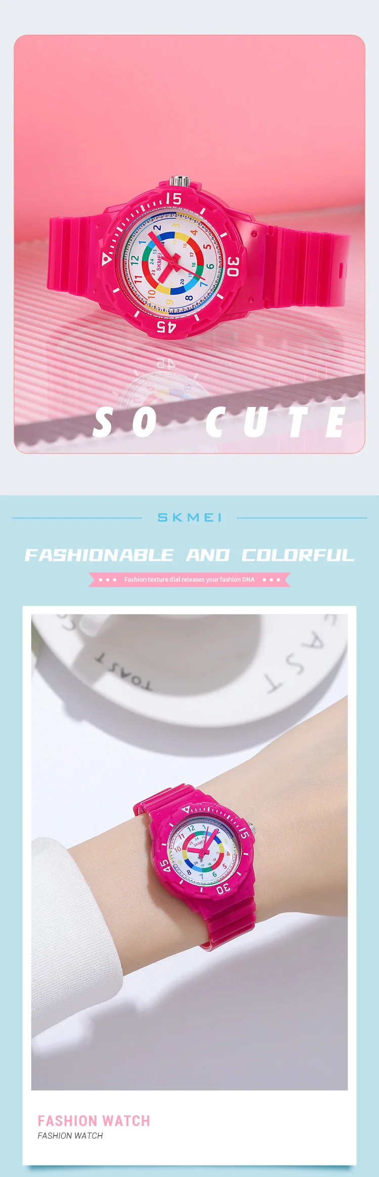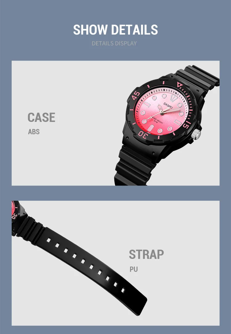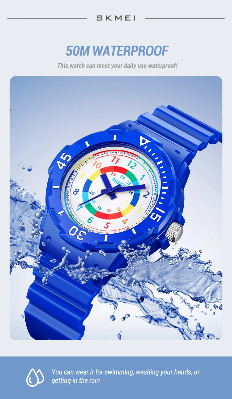 Les montres-bracelets étanches pour enfants SKMEI sont des montres de sport de qualité avec un mouvement à quartz japonais. Avec une épaisseur de boîtier de 11mm et une longueur de bande de 22.5 cm, ces montres conviennent aux garçons et aux filles. Leur largeur de bande est de 16mm et leur diamètre de cadran est de 34mm. Les montres SKMEI sont à la fois à la mode et adaptées aux activités sportives. Elles possèdent un fermoir en boucle et leur fenêtre de cadran est en résine. Ces montres sont étanches jusqu’à 50m et sont fabriquées en matériau de bande en PU. Chaque montre SKMEI authentique est fournie sans emballage.